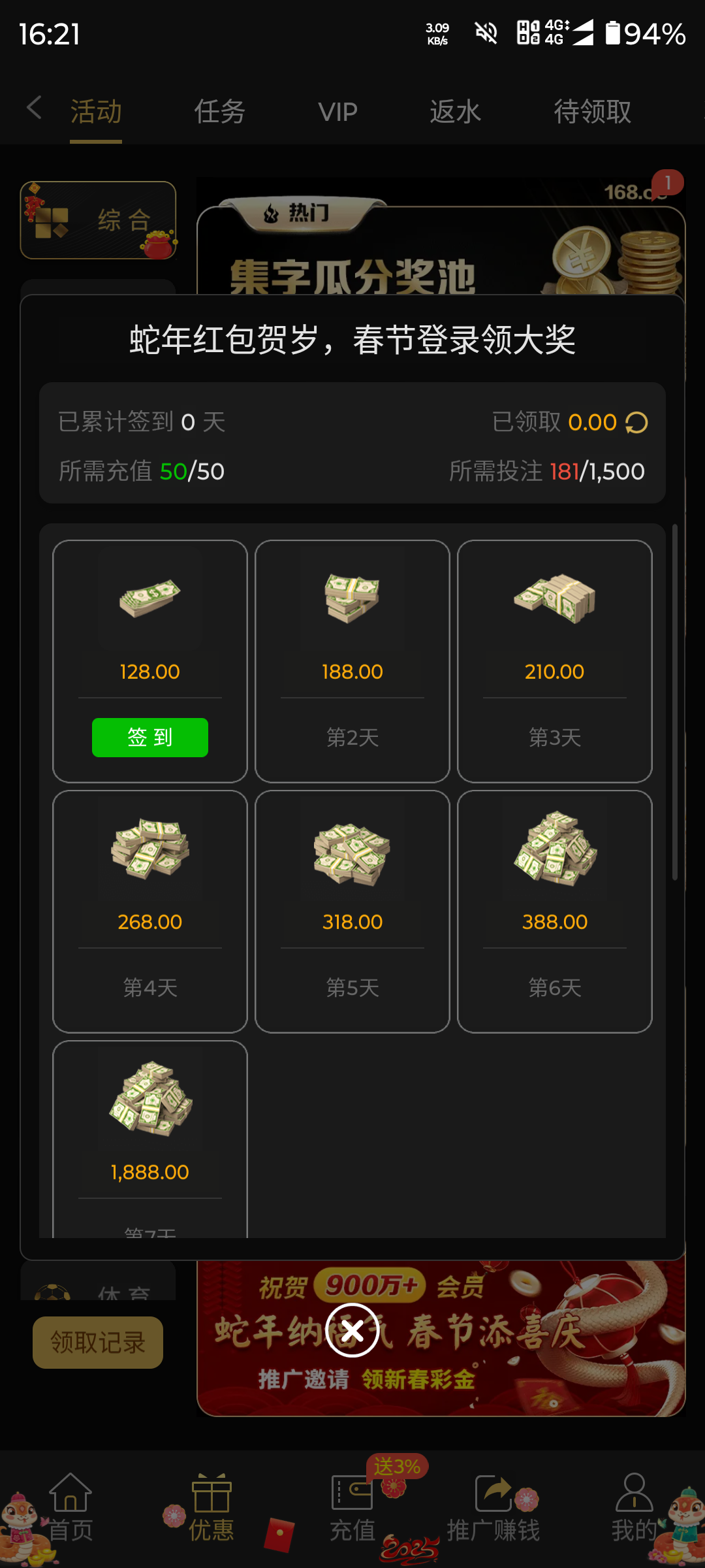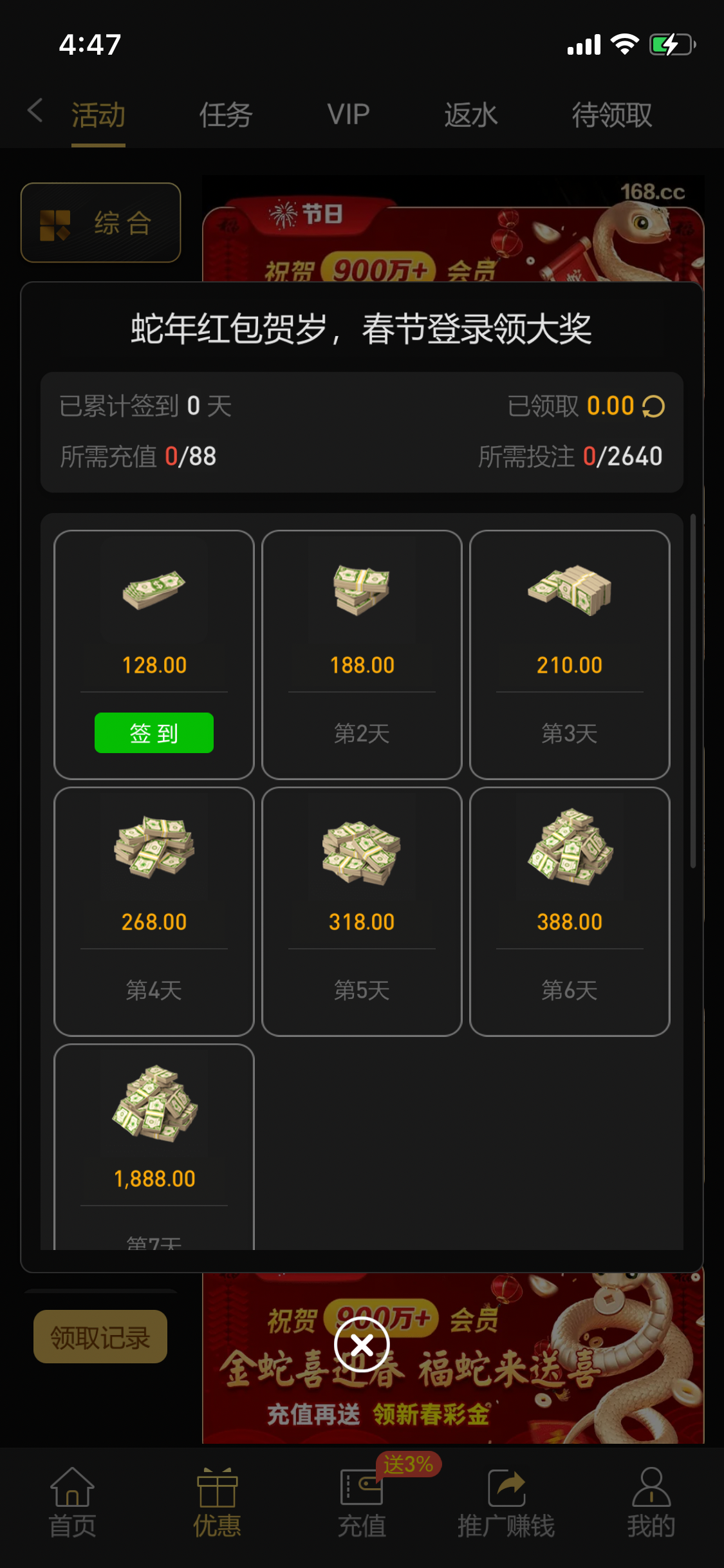 现在改成 充158 乘30倍 4740流水才能领了 刷流水很难吗 唯一缺点就是签到那个128只能打PG还限制10倍 是最恶心的