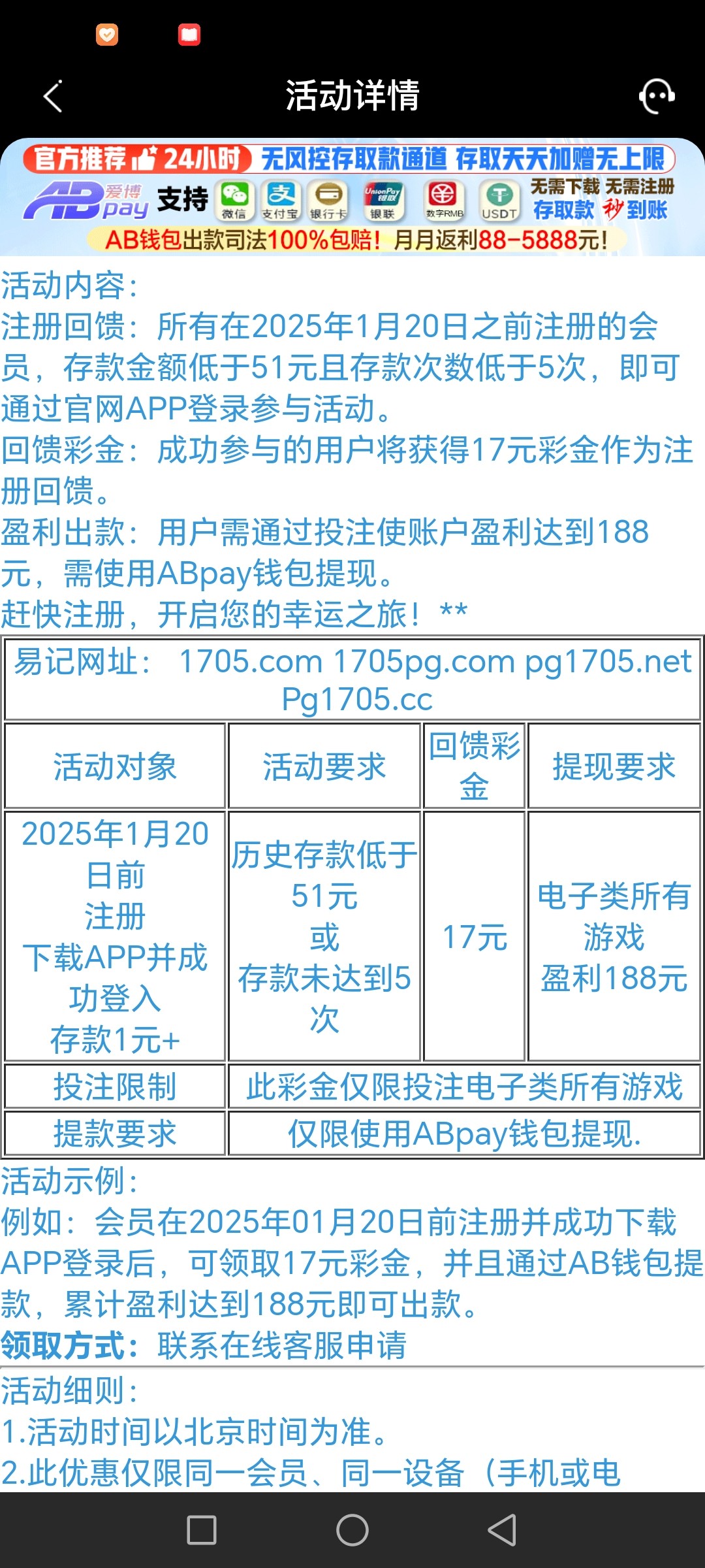 1月20日之前注册 金额低于51存款低于5次联系客服送17 满188提 链接 1705.com