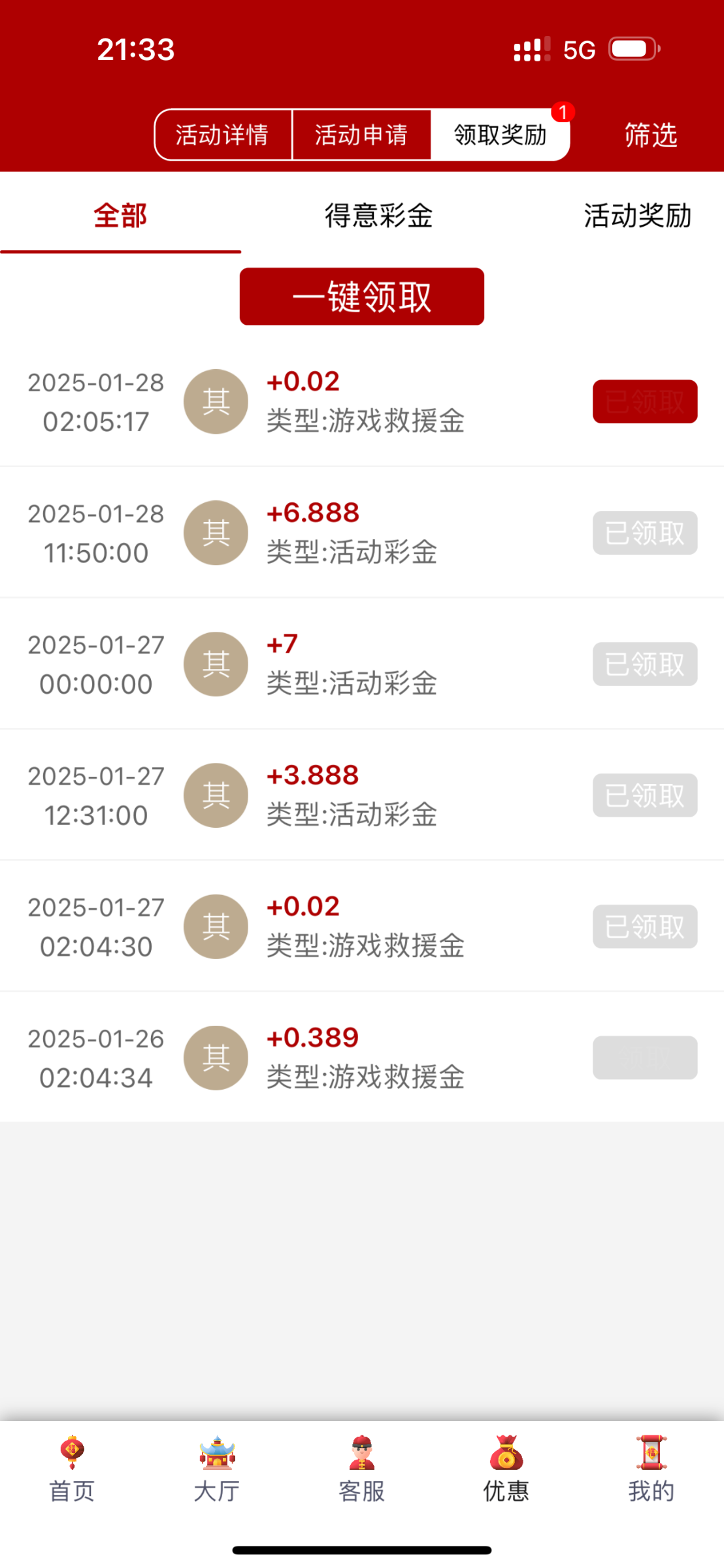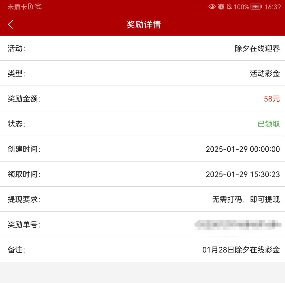 773除夕在线彩金已经派发,老哥们赶紧去领,祝大家新的一年大红大紫!