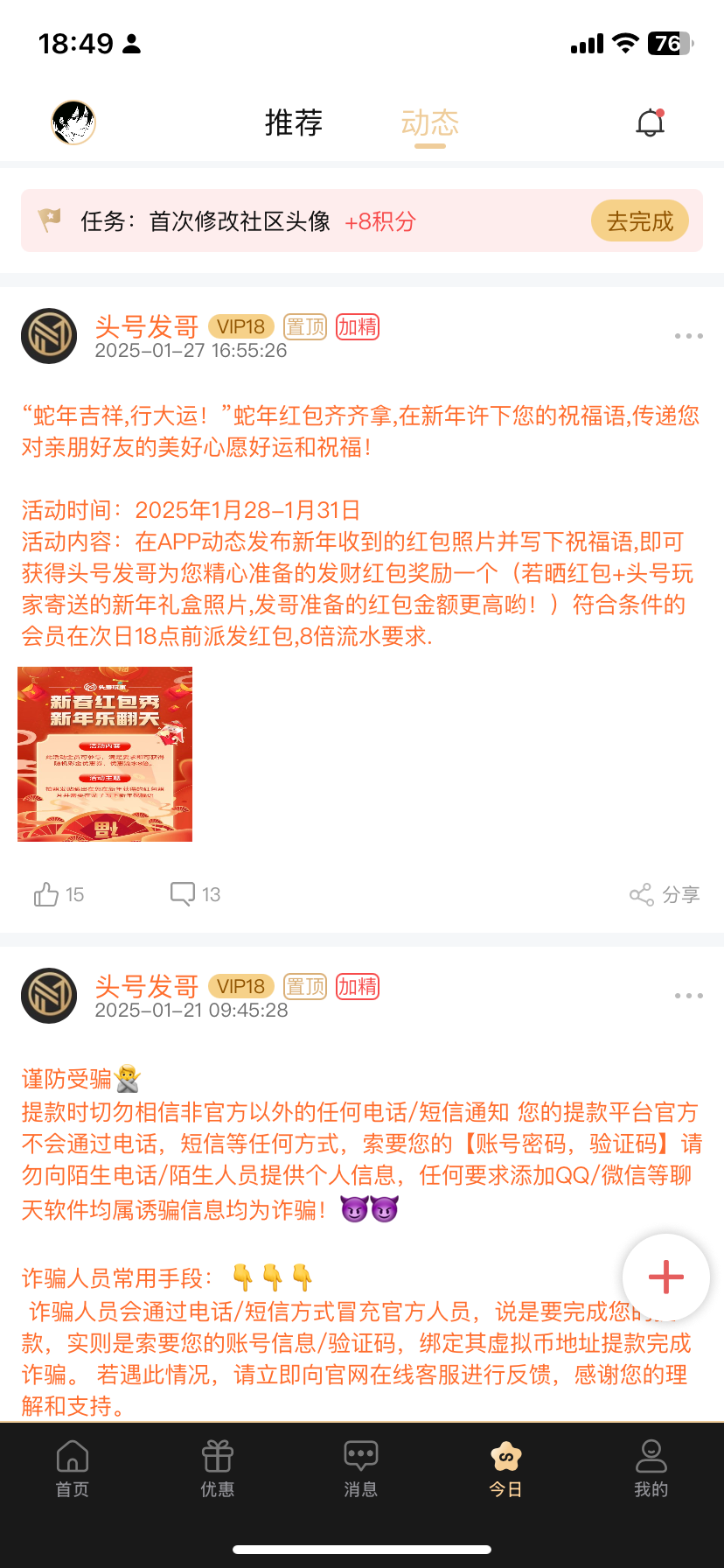 昨天发帖晒红包,今天给了18