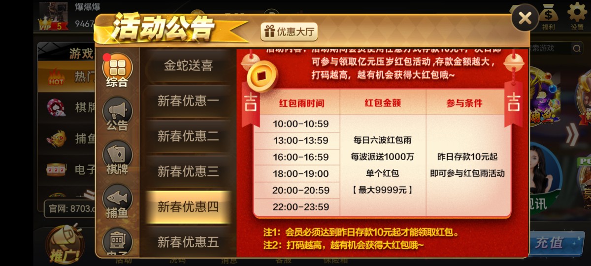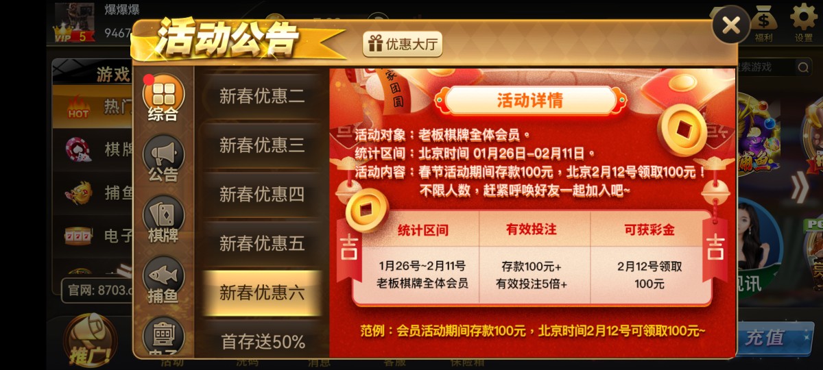 老板棋牌每天充10元第二天可以抢6波红包,活动持续到2月12号。 还有充100打码5倍流水12号送100的活动。官网8703.com 有感兴趣撸的可上,出款自测,交流分享,风险自理