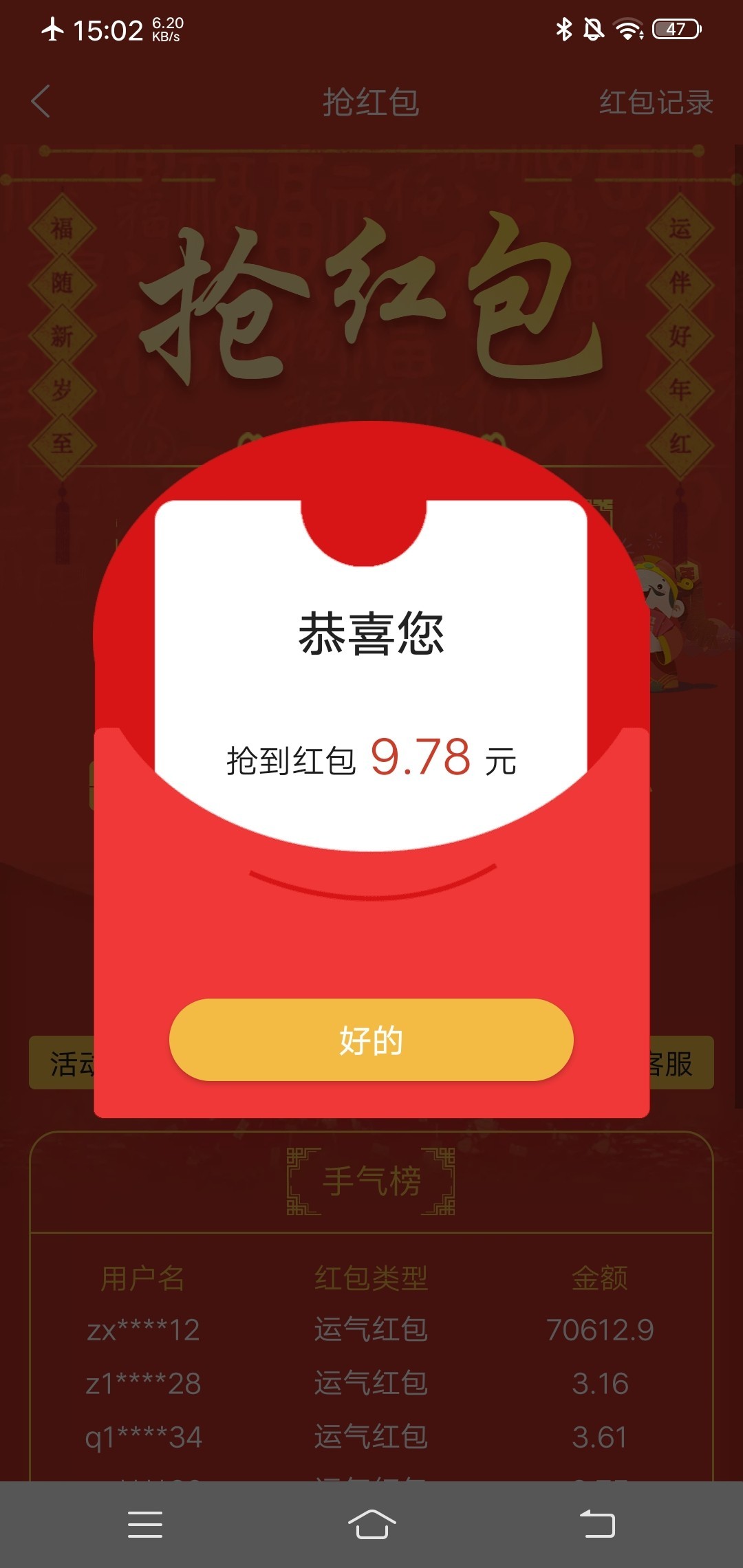 2018 大年三十抢到一个9.25二十五倍 奖励 给了200多