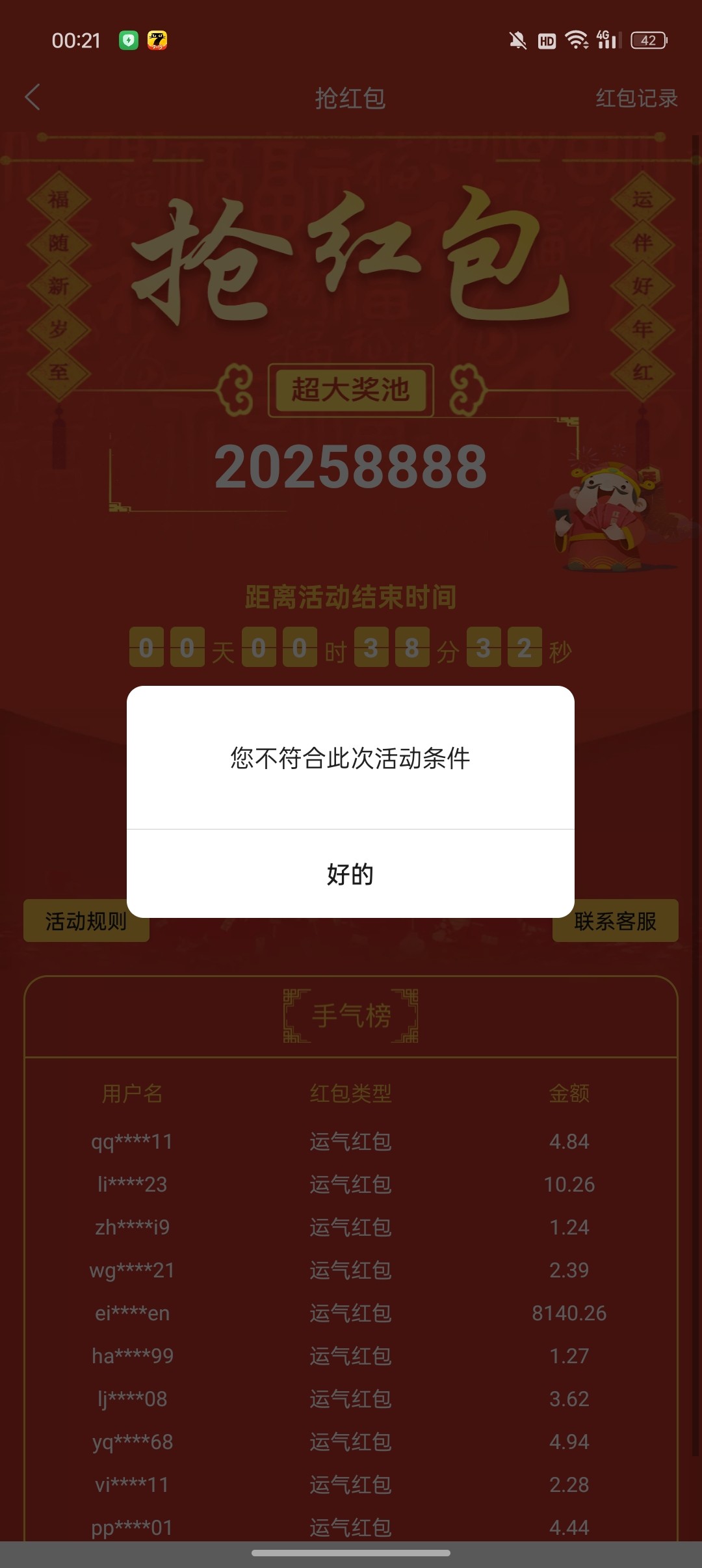 老哥们你们红包加赠都是多少钱,每次抢到翻倍就一两块,不翻倍还能抢十几块