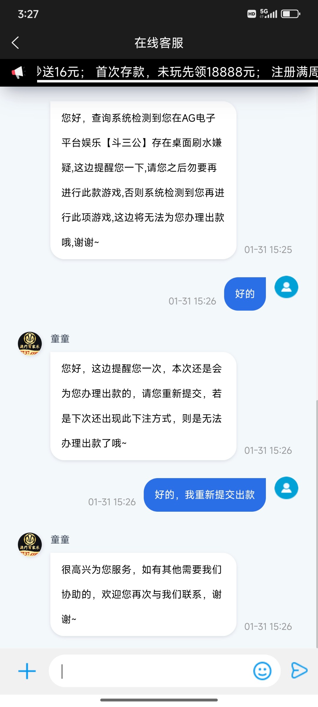 赢钱就是不欢迎,精彩网老节目了,百家乐也是赢了就是不接受百家乐投注非让你玩pg或者wl电子刷流水 ,那逼玩意杀得很,十个八个刷流水死球。
