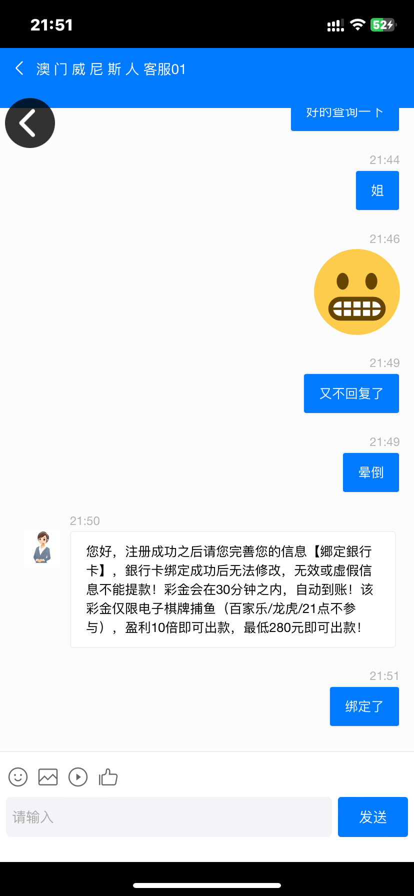 您好,注册成功之后请您完善您的信息【绑定银行卡】,银行卡绑定成功后无法修改,无效或虚假信息不能提款!彩金会在30分钟之内,自动到账!该彩金仅限电子棋牌捕鱼(百家乐/龙虎/21点不参与),盈利10倍即可出款,最低280元即可出款! 废了吧,自动到=不到
