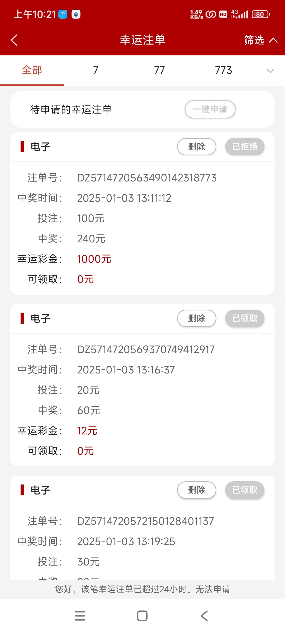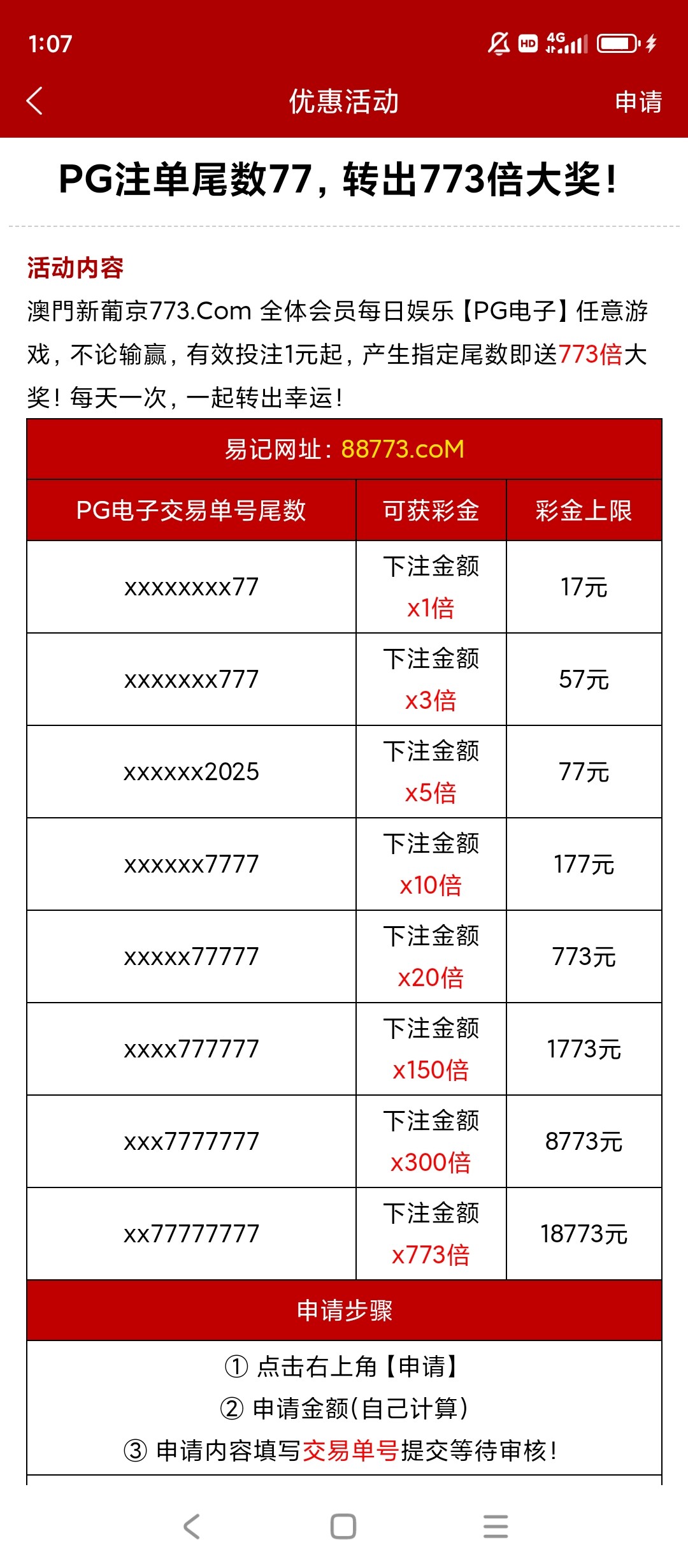 笨蛋楼主是第一天申请注单嘛 773有两个注单号 一个是外面它自动抓取的那个尾号773那个投注 另一个就是pg电子尾数77 777 7777的要自己去申请不过正常平台尾数777都是10倍 773比较垃圾3个7才3倍