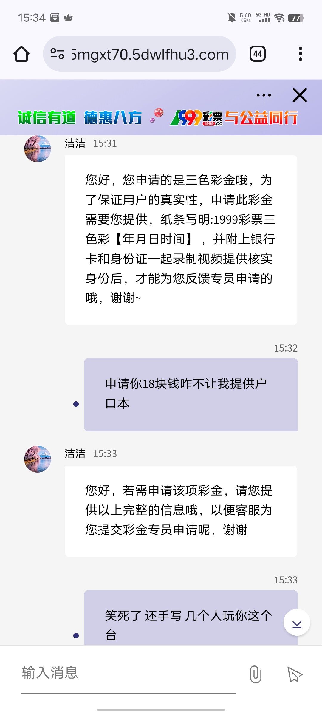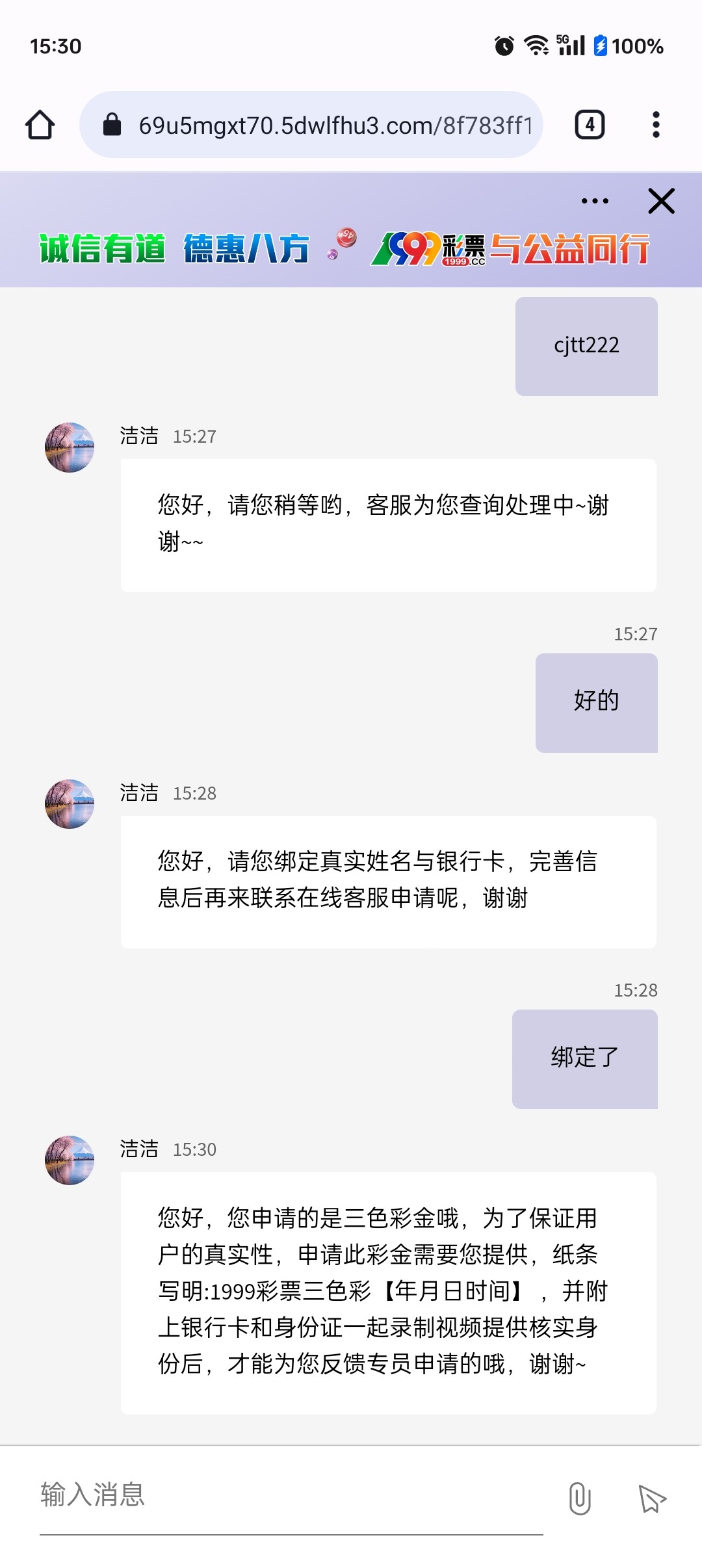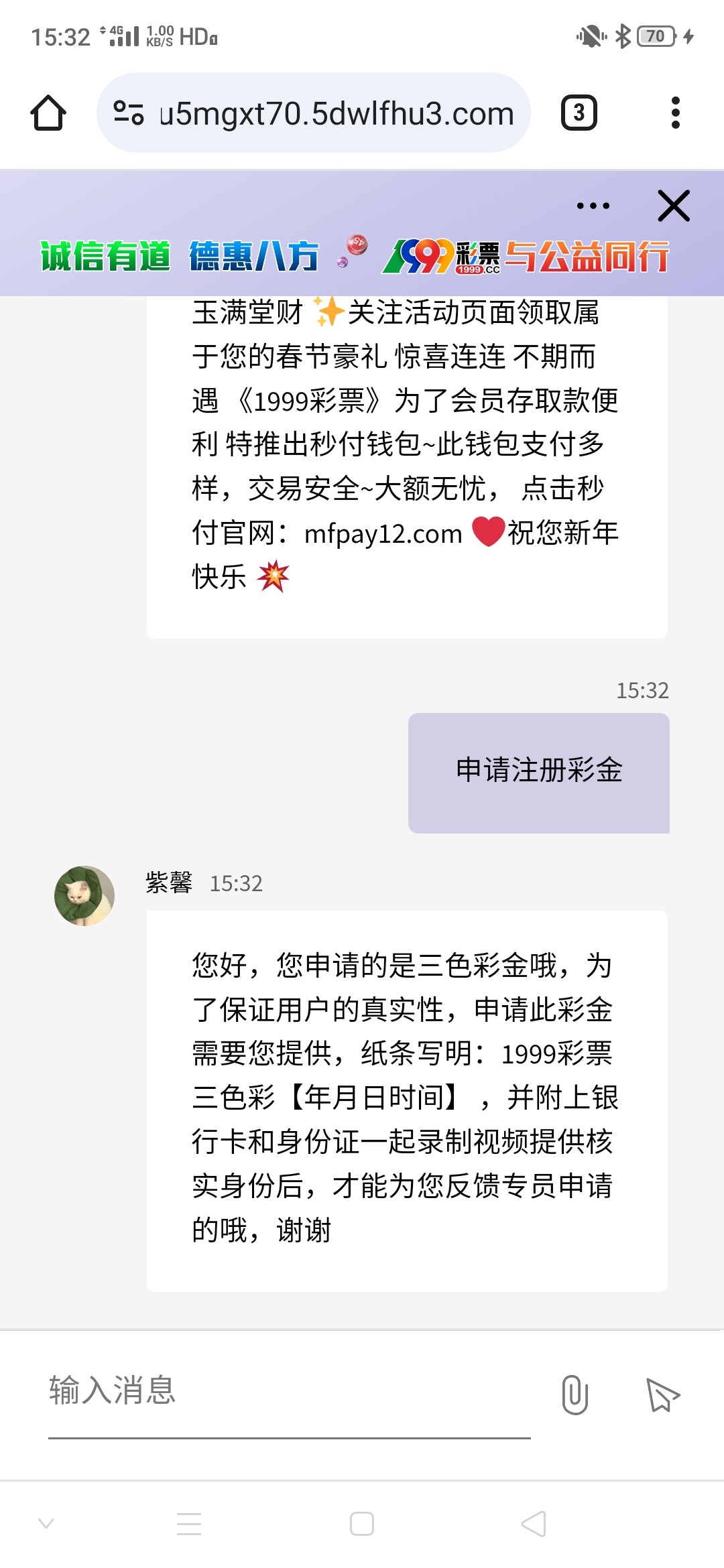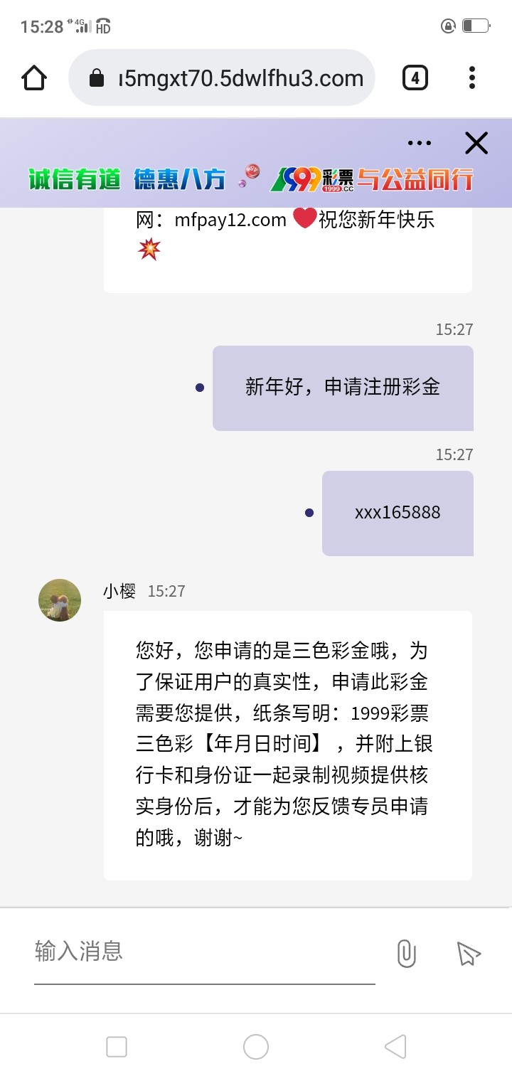 您好,您申请的是三色彩金哦,为了保证用户的真实性,申请此彩金需要您提供,纸条写明:1999彩票三色彩【年月日时间】 ,并附上银行卡和身份证一起录制视频提供核实身份后,才能为您反馈专员申请的哦,谢谢