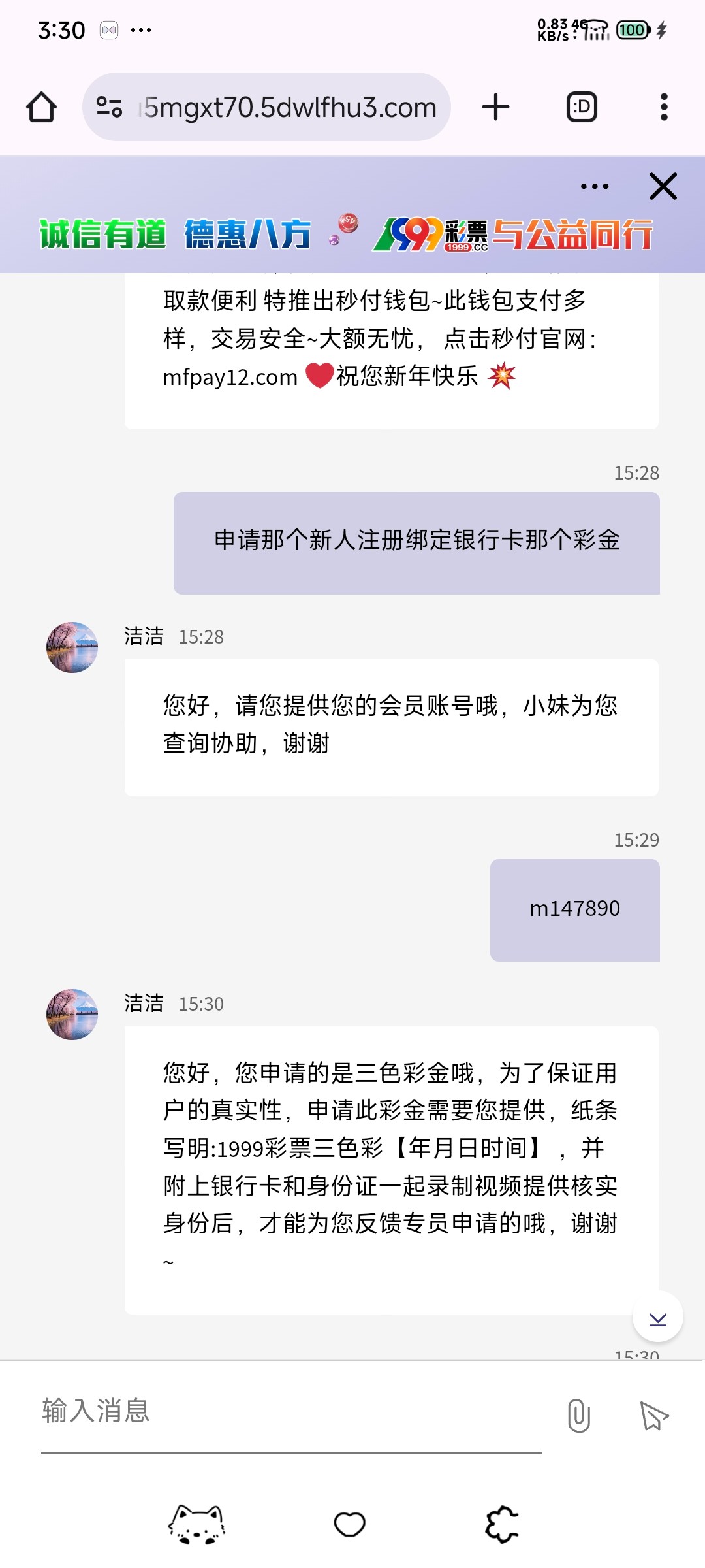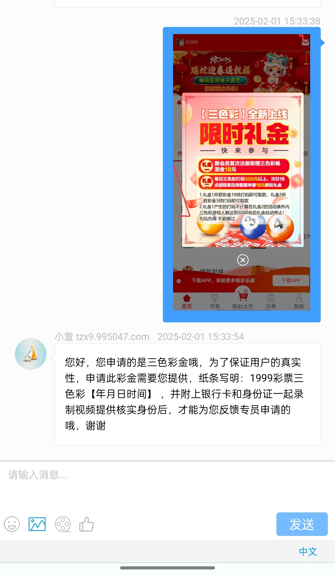 您好,您申请的是三色彩金哦,为了保证用户的真实性,申请此彩金需要您提供,纸条写明:1999彩票三色彩【年月日时间】 ,并附上银行卡和身份证一起录制视频提供核实身份后,才能为您反馈专员申请的哦,谢谢~