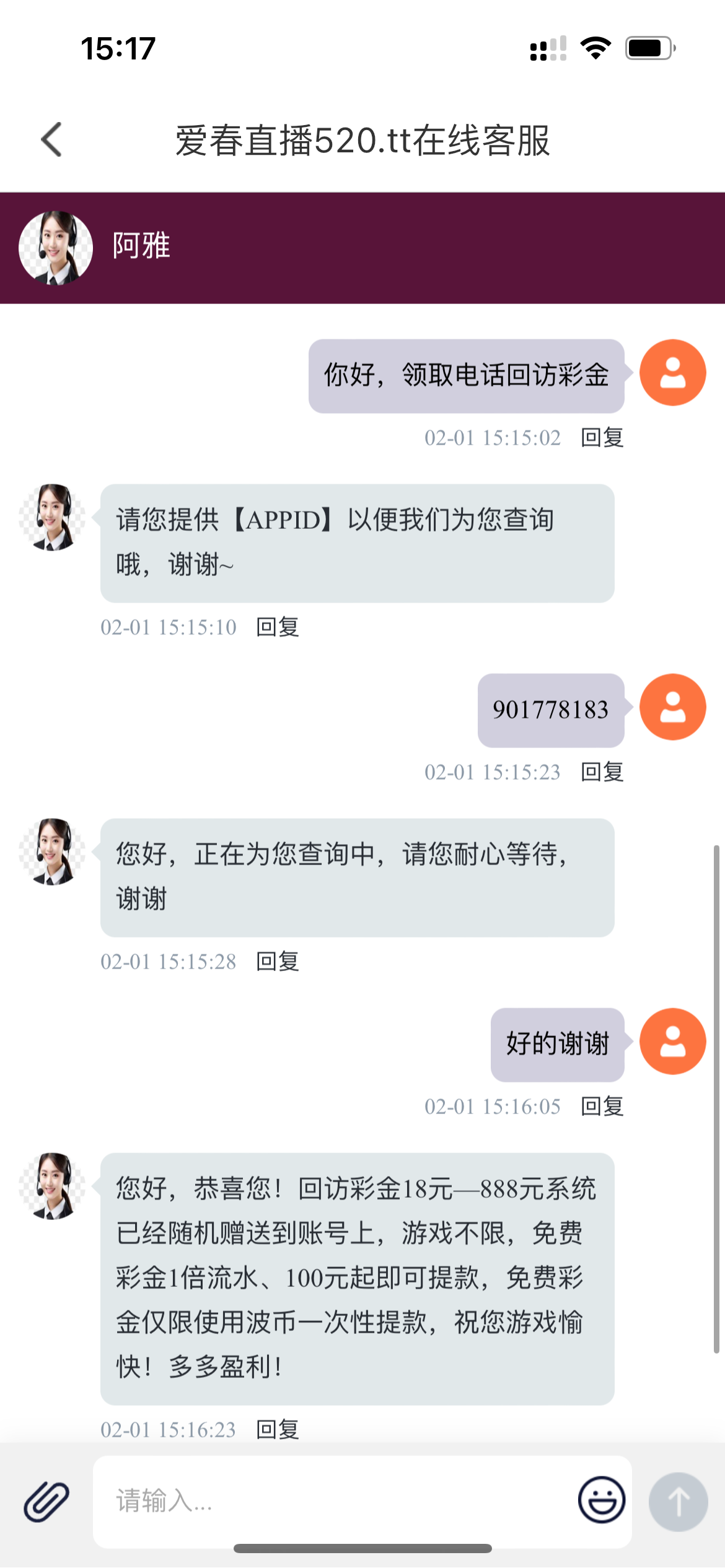 联系在线客服说电话回访,我两个号都领到了38,网址520.tv,520.tt