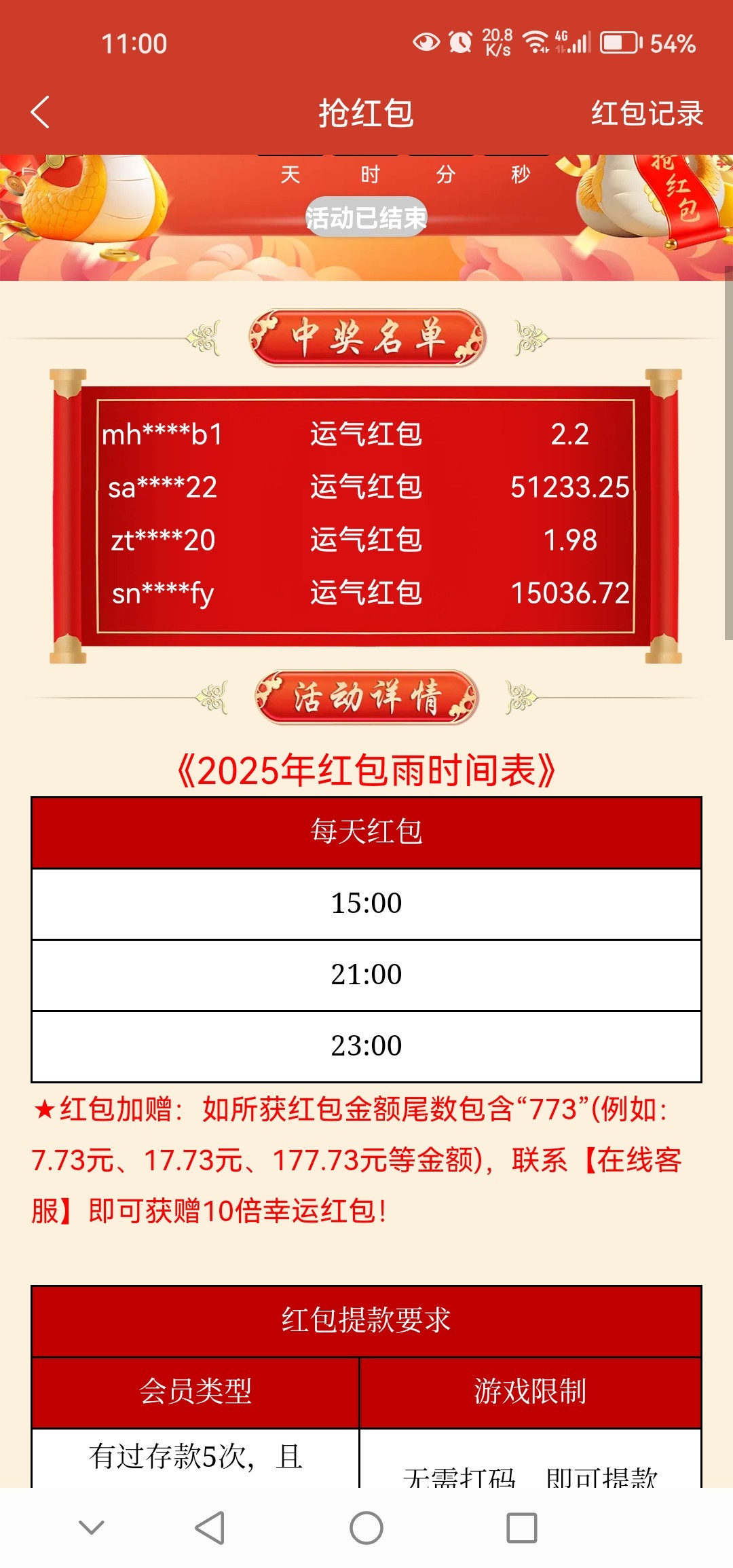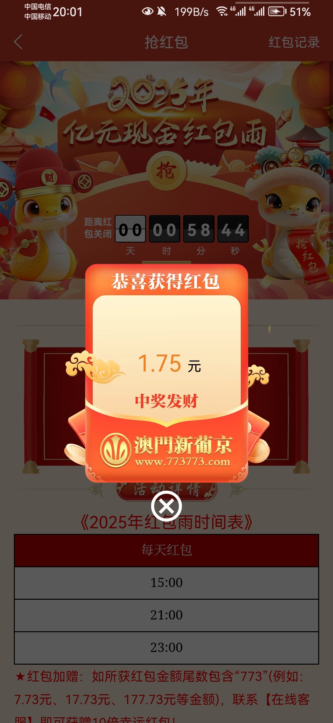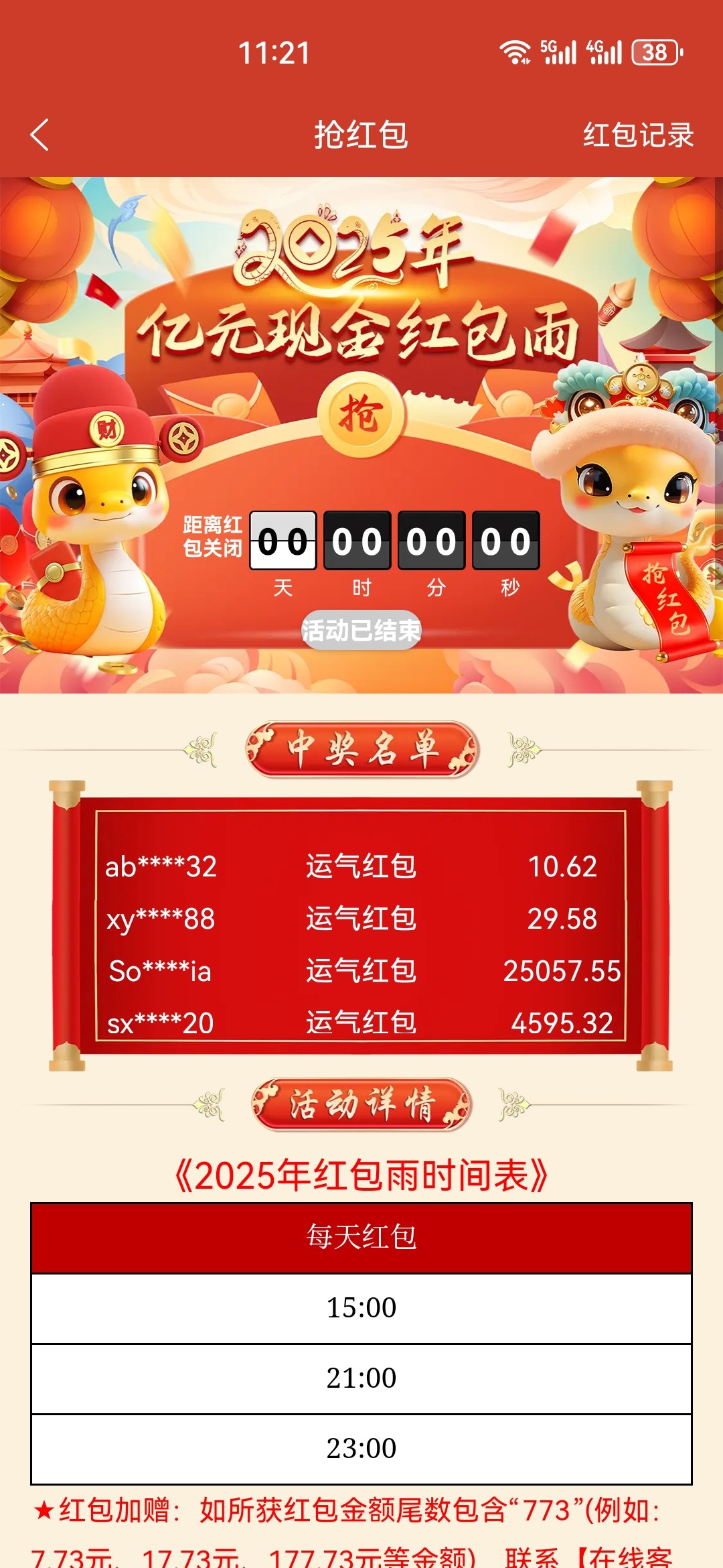 今天初五 773红包尾数5就会有10倍加赠。