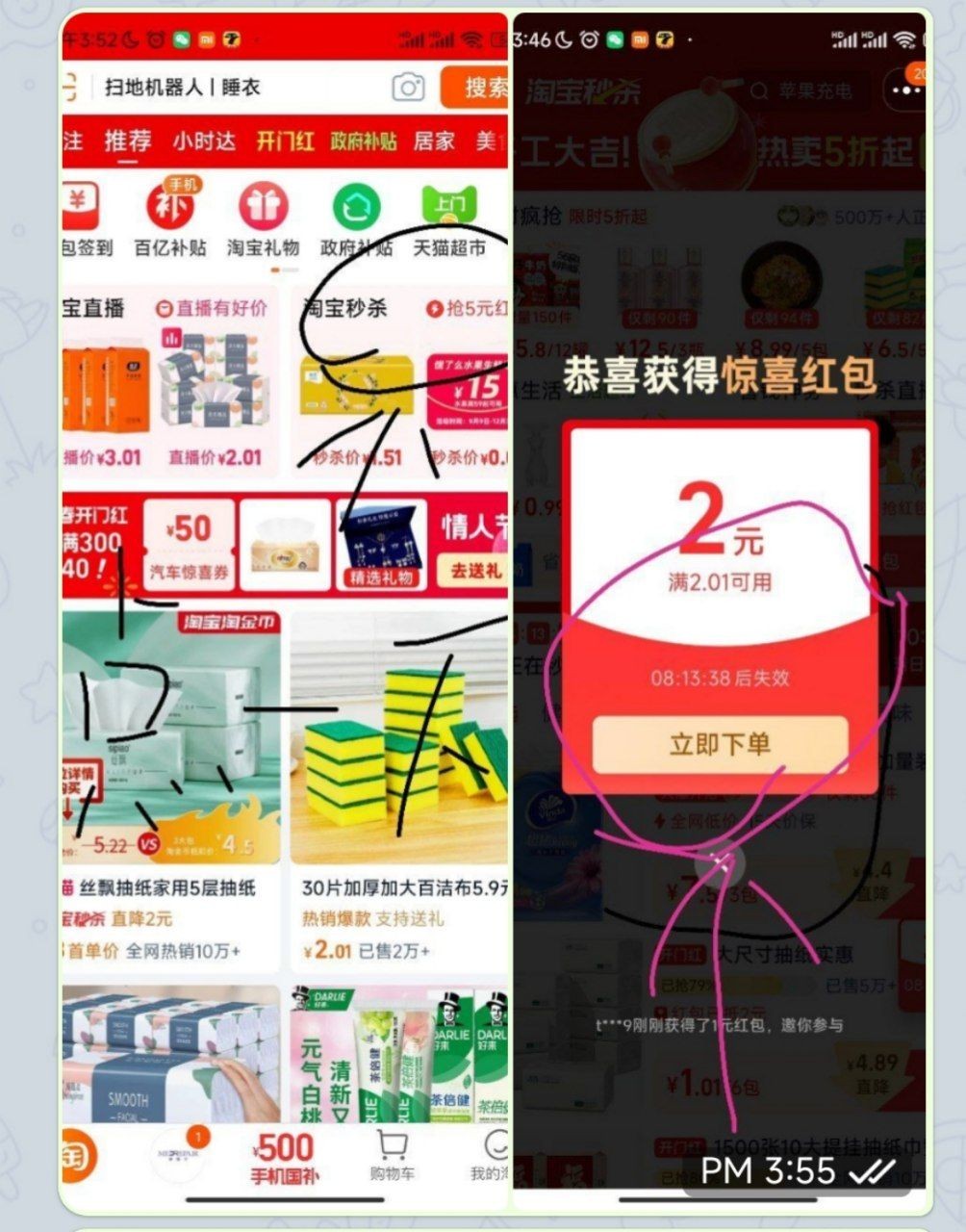 第2部在淘宝主页点击淘宝秒杀,进去之后几秒钟会自动弹红包,点击领取
