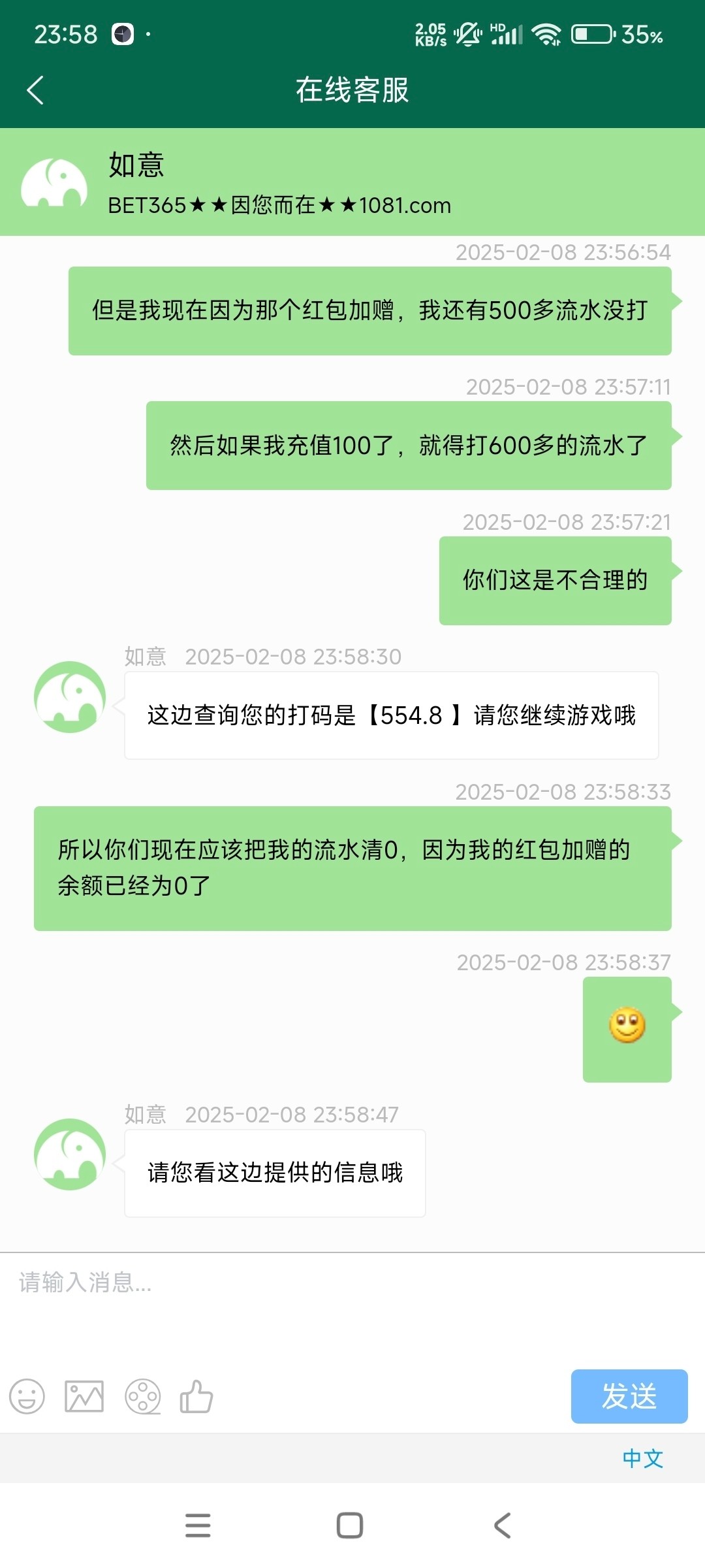 申请红包加赠后续来了,88的加赠要我打15倍流水,流水还不够已经洗白了,但是还有几百多的流水,找客服还不给我清零流水,真的被恶心到了。原来红包能直接出款的,现在别说抢红包拿饭钱了,现在就算你充值,你也得把剩下的流水打完才能出款了,煞笔1036,申请红包加赠得谨慎了