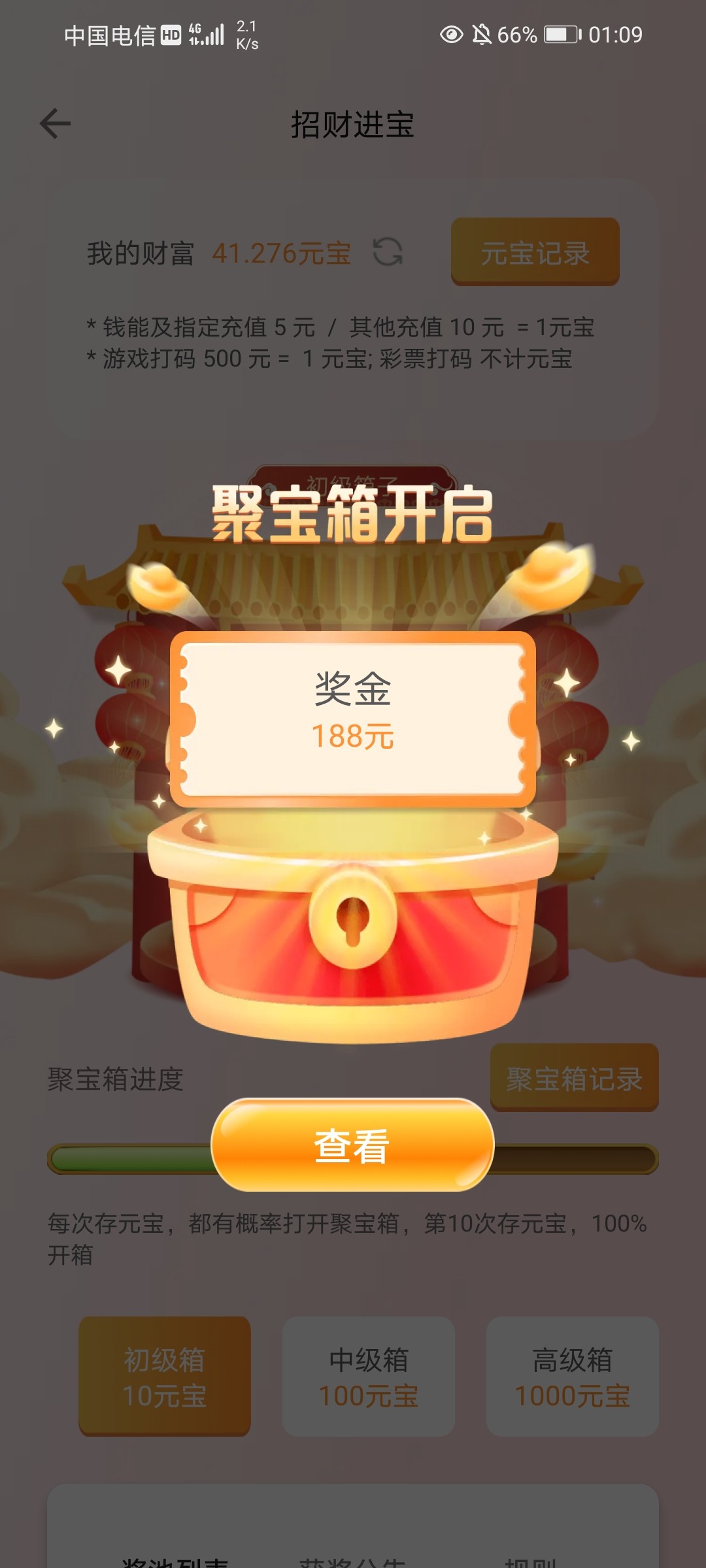 773开初级宝箱居然爆了 好意外,流水也不大,充值也没多少。之前开了两次几块。而且都是拉满100%才开的。这次开40%就爆了188