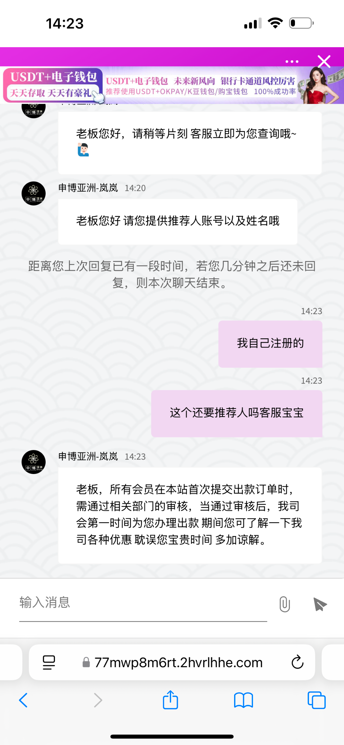 aa131160 ▶ shen2416 我的昨天9点提的,冲100提300一直说审核,跟你一样要推荐人,垃圾台子 11月前