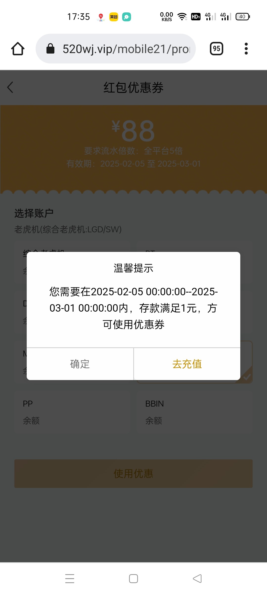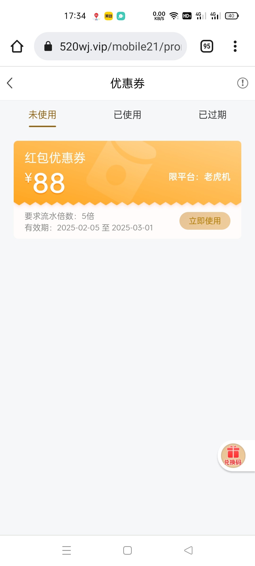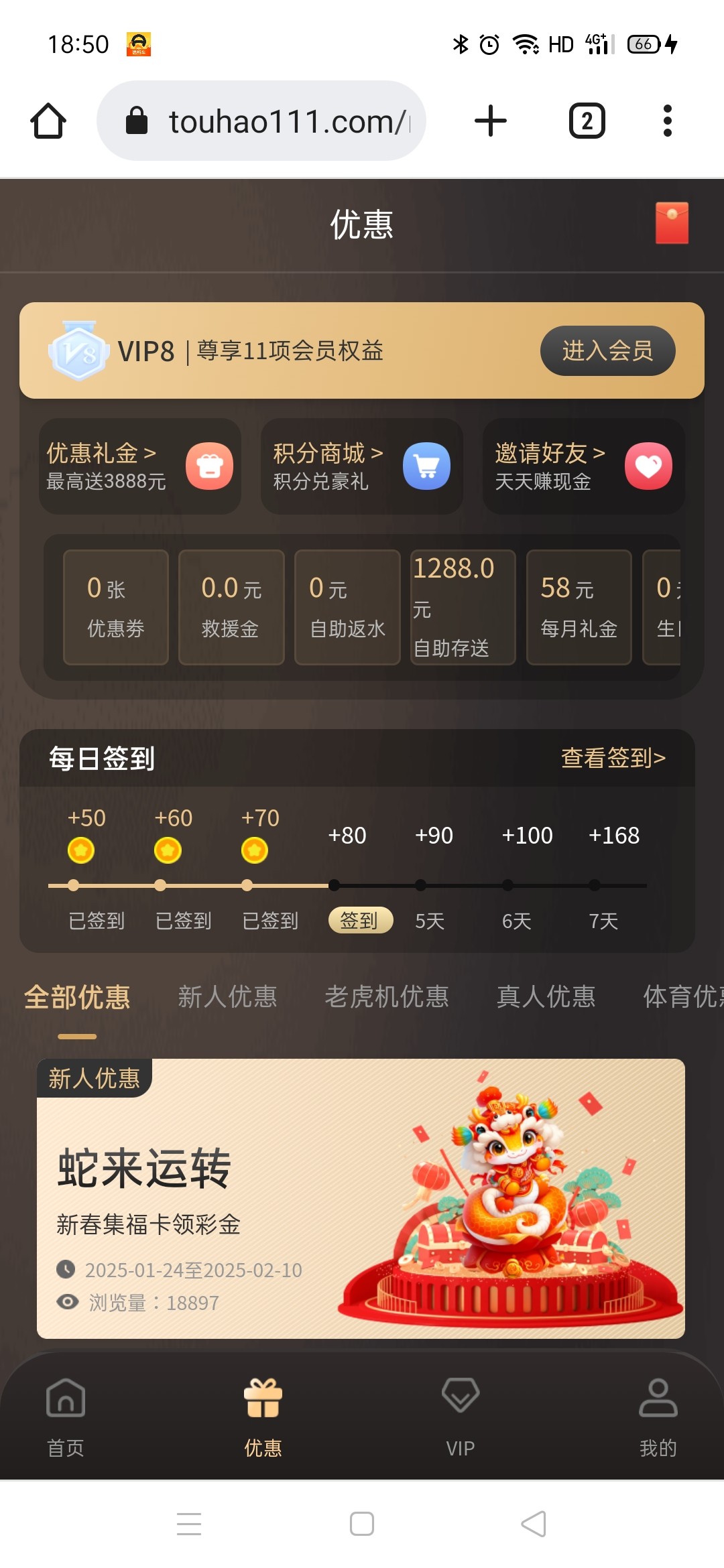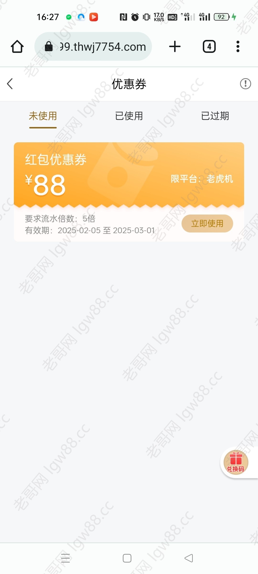 送了一张老虎机88的卷 不要求充值 前段时间冲过100送88卷