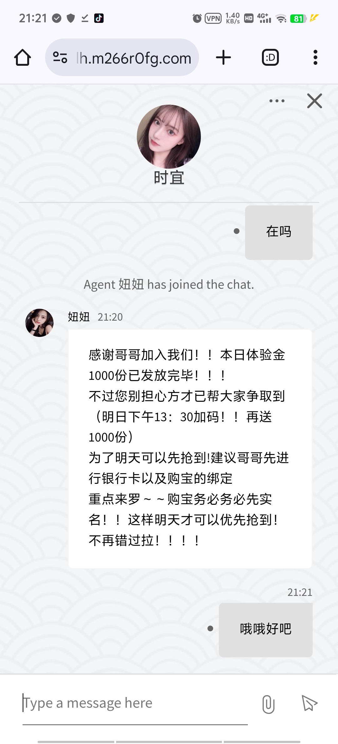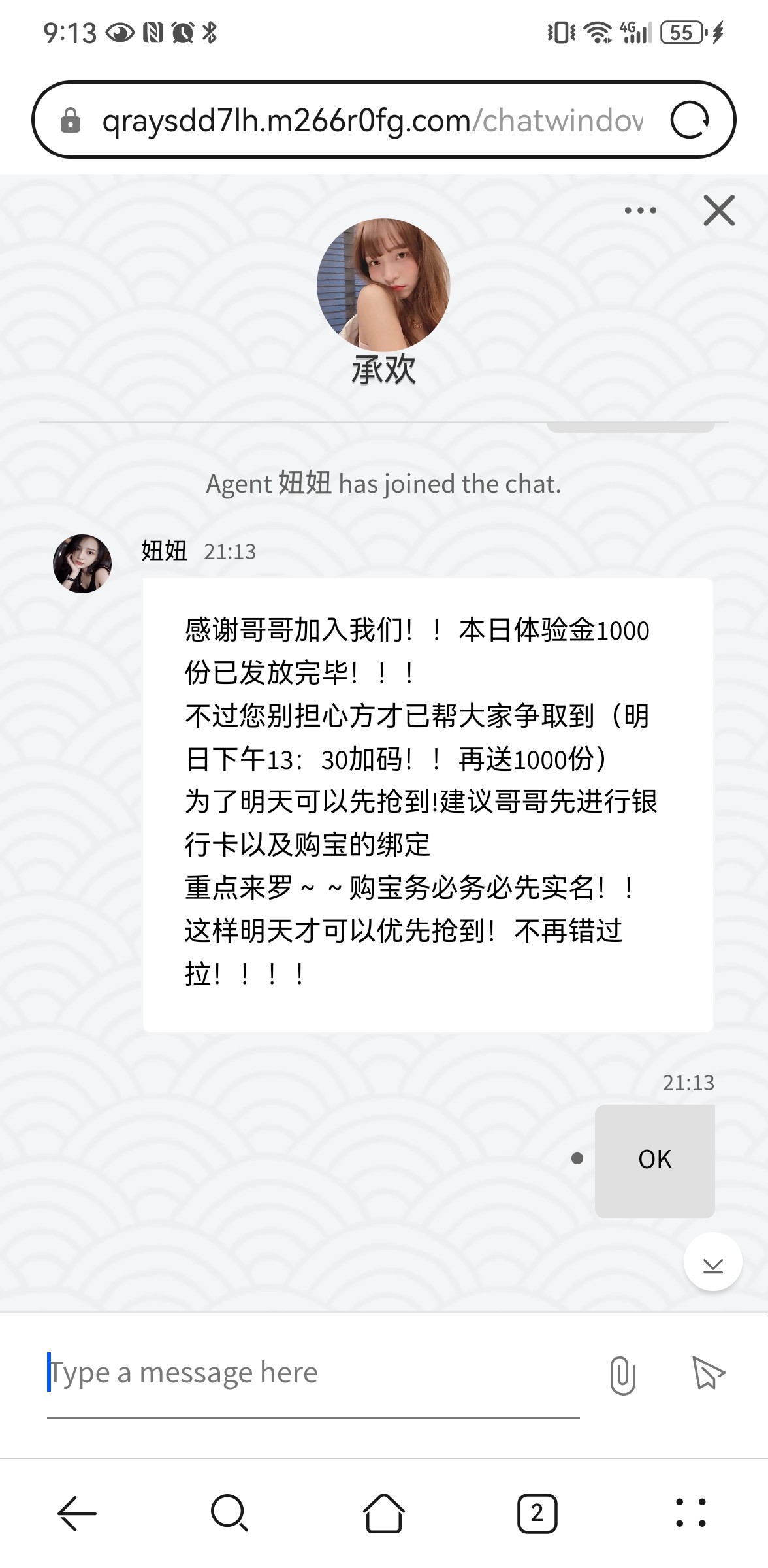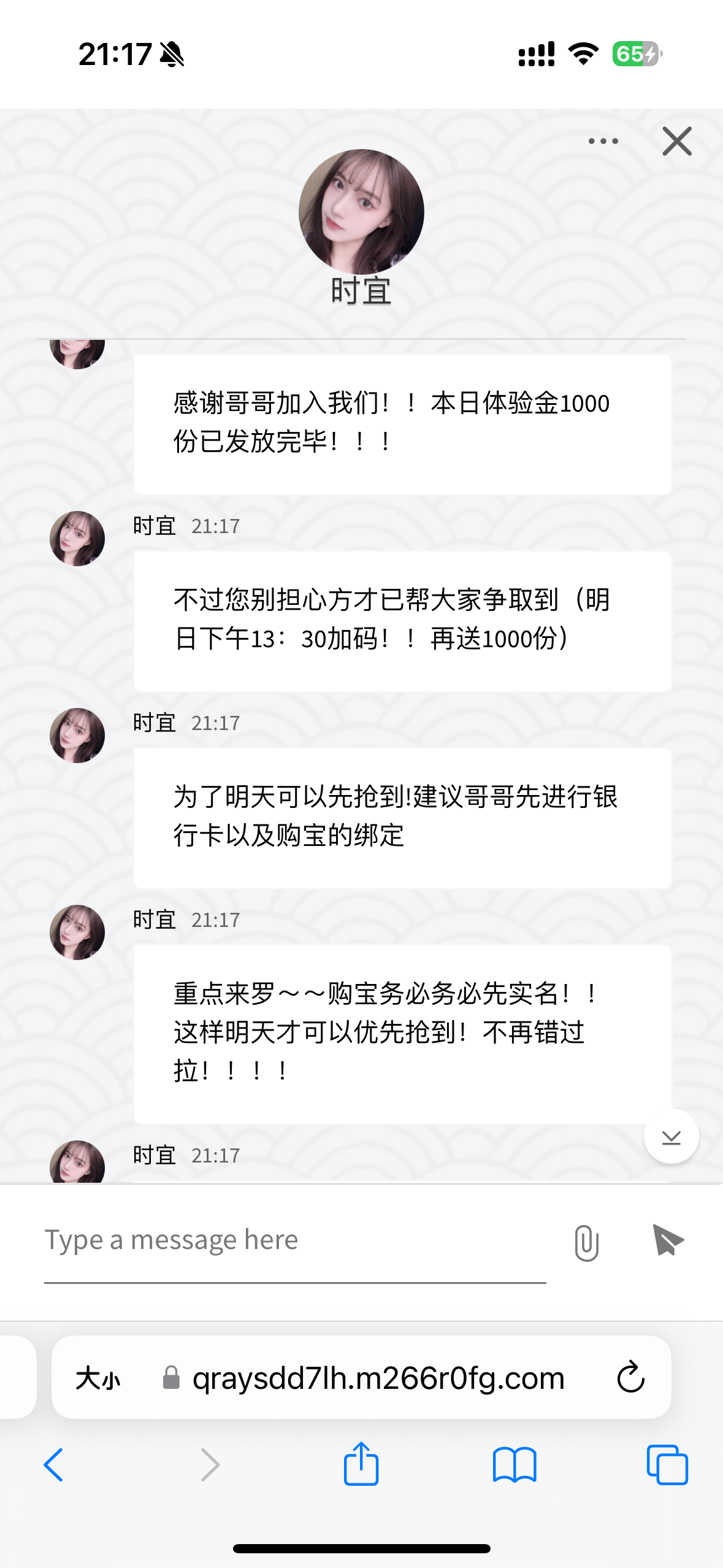 感谢哥哥加入我们!!本日体验金1000份已发放完毕!!!不过您别担心方才已帮大家争取到(明日下午13:30加码!!再送1000份)为了明天可以先抢到!建议哥哥先进行银行卡以及购宝的绑定重点来罗~~购宝务必务必先实名!!这样明天才可以优先抢到!不再错过拉!!!!