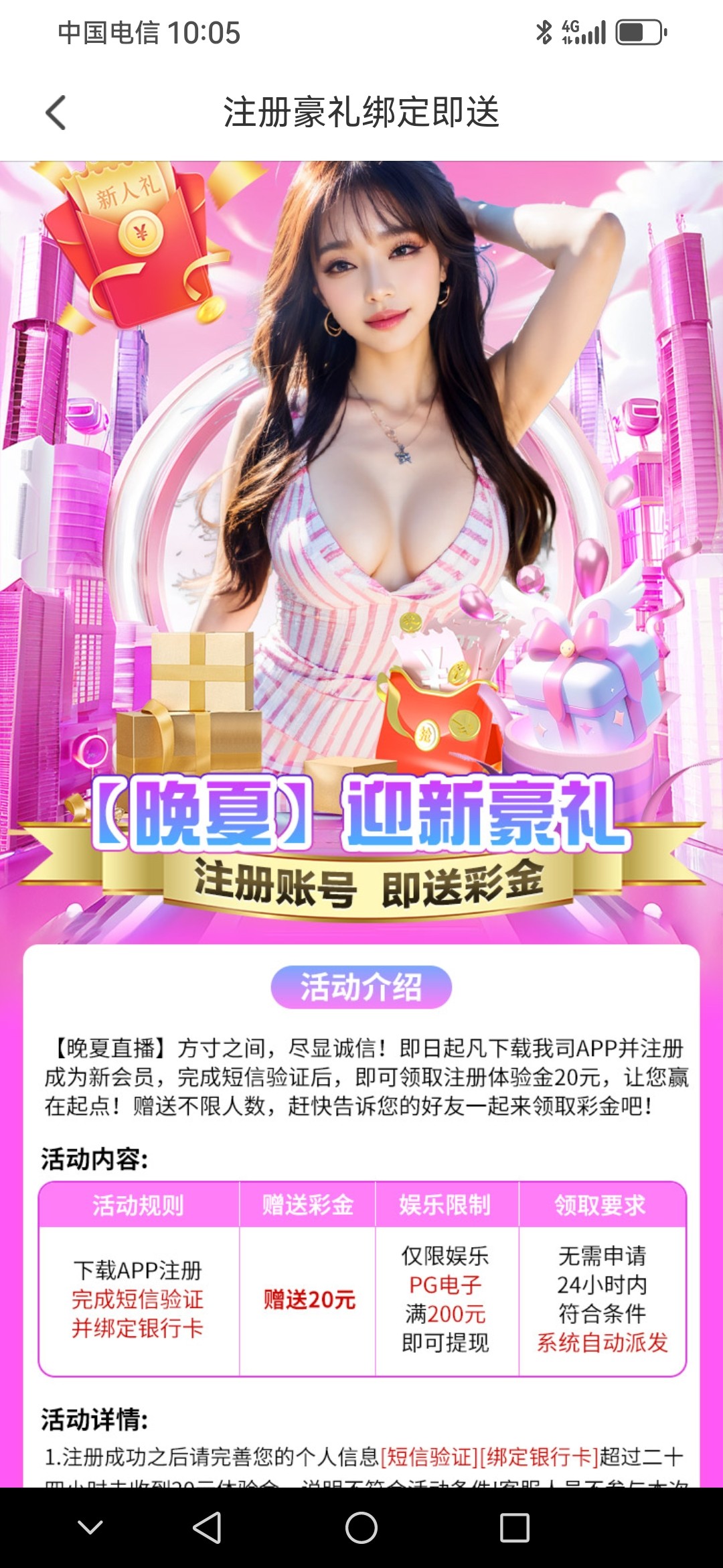注册绑卡24小时内自动送20,我的2个小时才送的,不送的直接卸载!勿充值!白嫖即可!