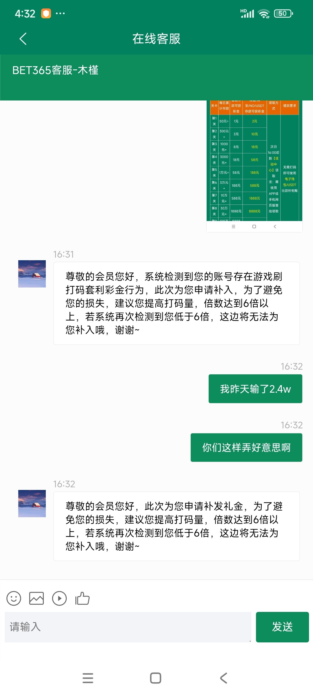 输了2.4w还几把要求那么多。以后要我打6倍流水。还说我刷流水套利,关键我充3w连4倍流水都没打到。曹尼玛越想越气。除了776这是我遇到第二个比畜生还畜生的精彩系列台子