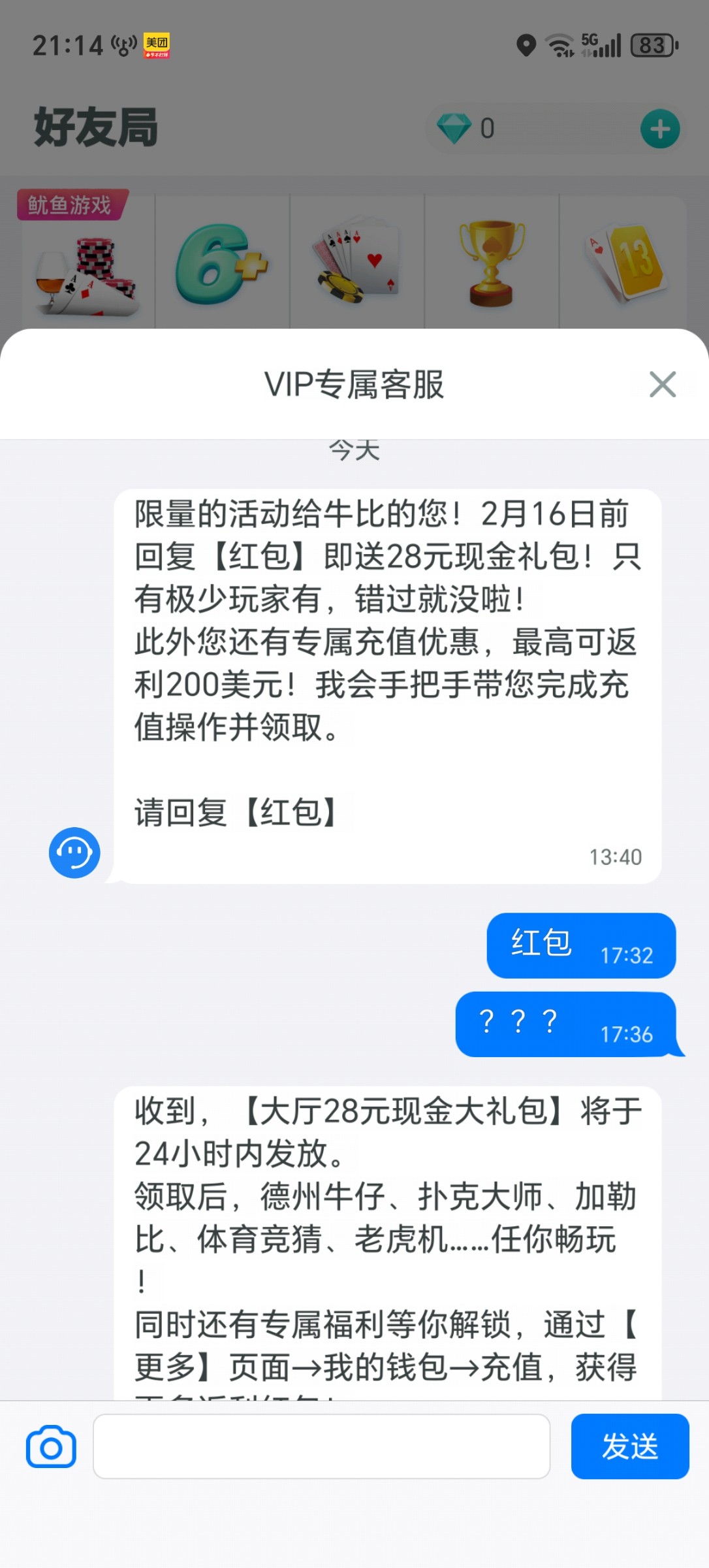今天登录看到有vip客服发消息,回复红包,就能领28。