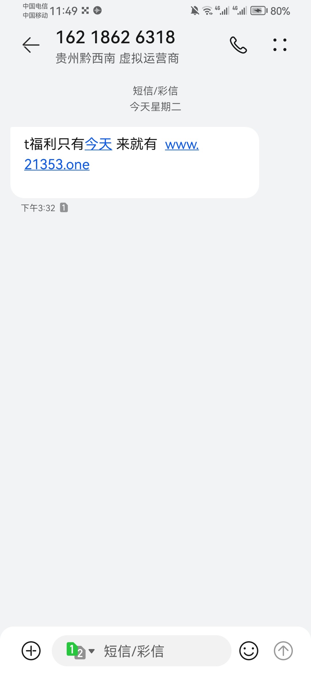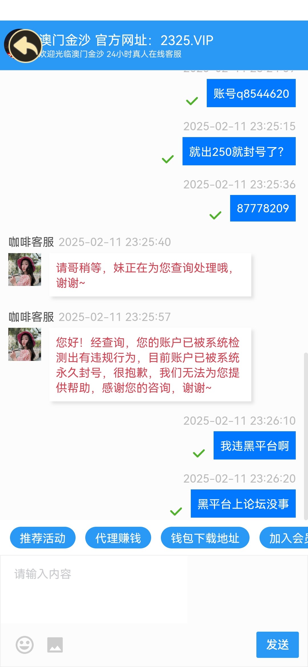 今天收到短信进入问客服冲100送88,打到300,不给提现直接冻结账号网址2325.vip注意本人