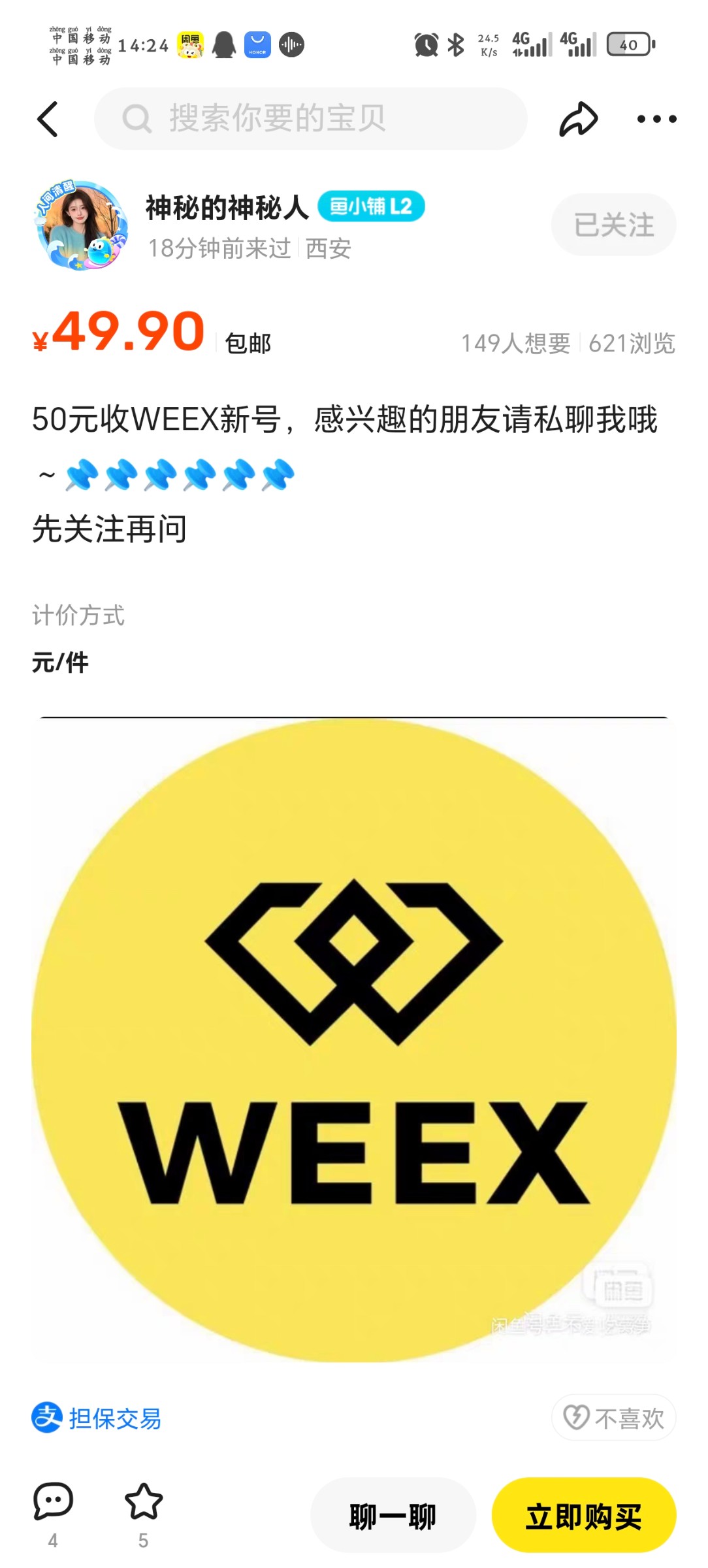 闲鱼上weex 很多商家50收一个实名认证 可以搞