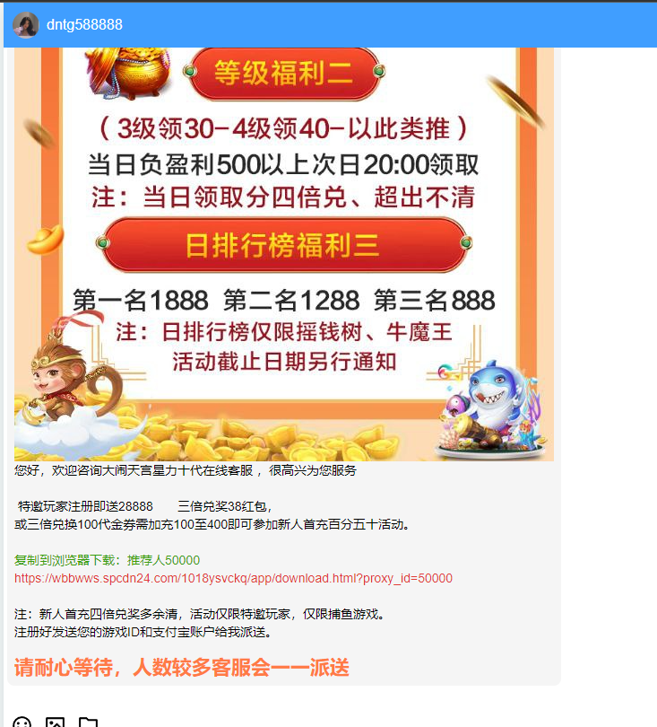 哥们儿,我给你普及一下,经常发我支付宝送28,888打3倍流水86,664,才提38块,我经常提捕鱼,人家有些几十块钱都舍不得提,人家猛打,我操,我曾经看到。200万他都还不下分。最后全部输了