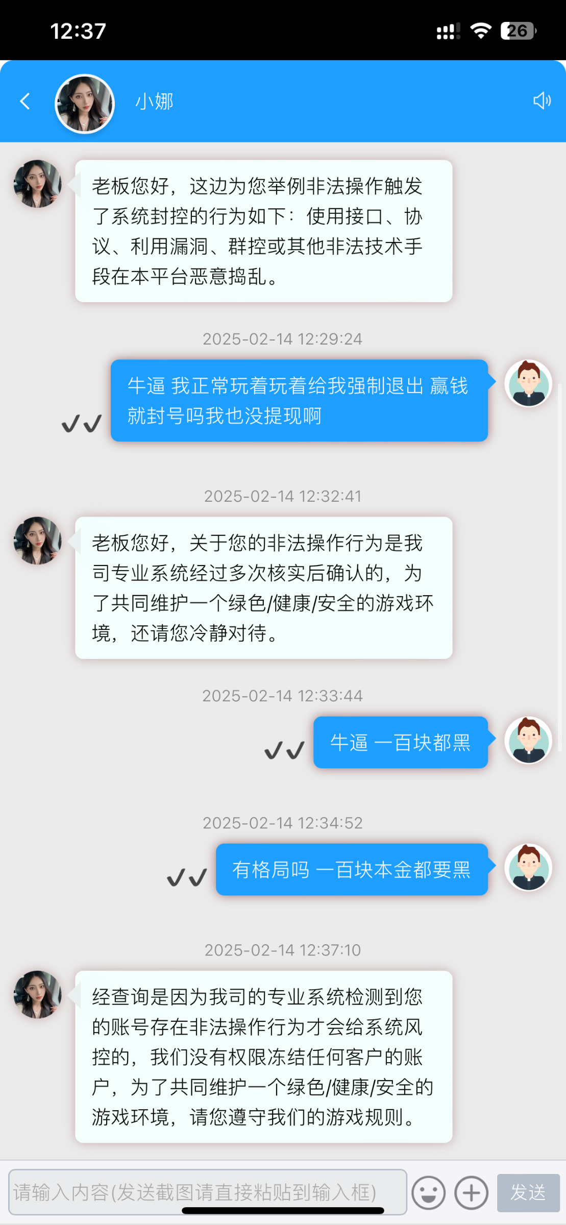 黑台曝光 起点说特邀领了18打到300只能提120半天给提现了 看到有以小博大活动玩玩 挺顺的结果玩着玩着号强制退出 客服说我违规操作 我都是看规则玩的没违规强制这样 避坑 没格局的台子 充值100限制提一千还被这样搞 恶心
