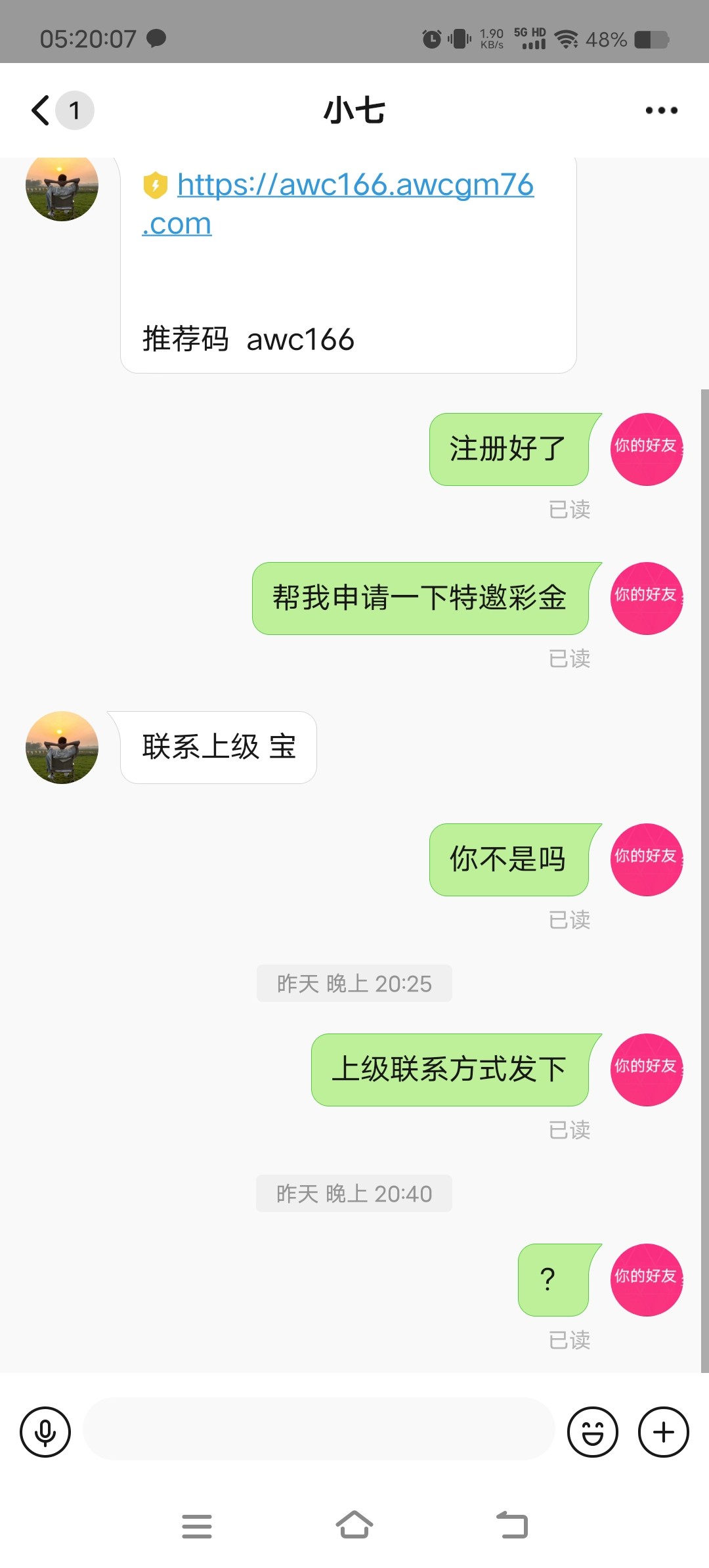 加了最后一个,他说找上级领,这3个都不是一条代理线,你们注意吧