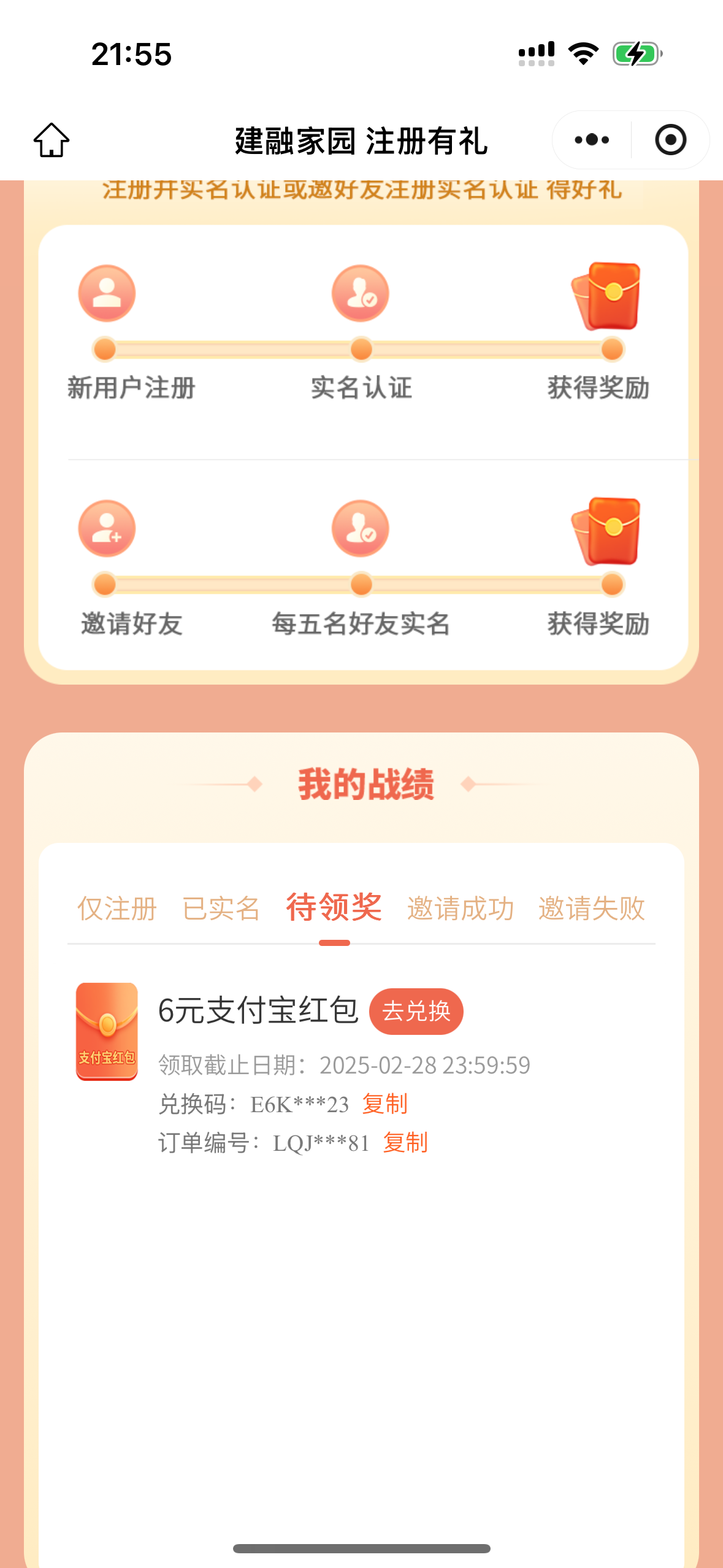 微信搜小程序建融家园进去看我发的图点进去登陆注册实名认证一下就行兑换码满15减6