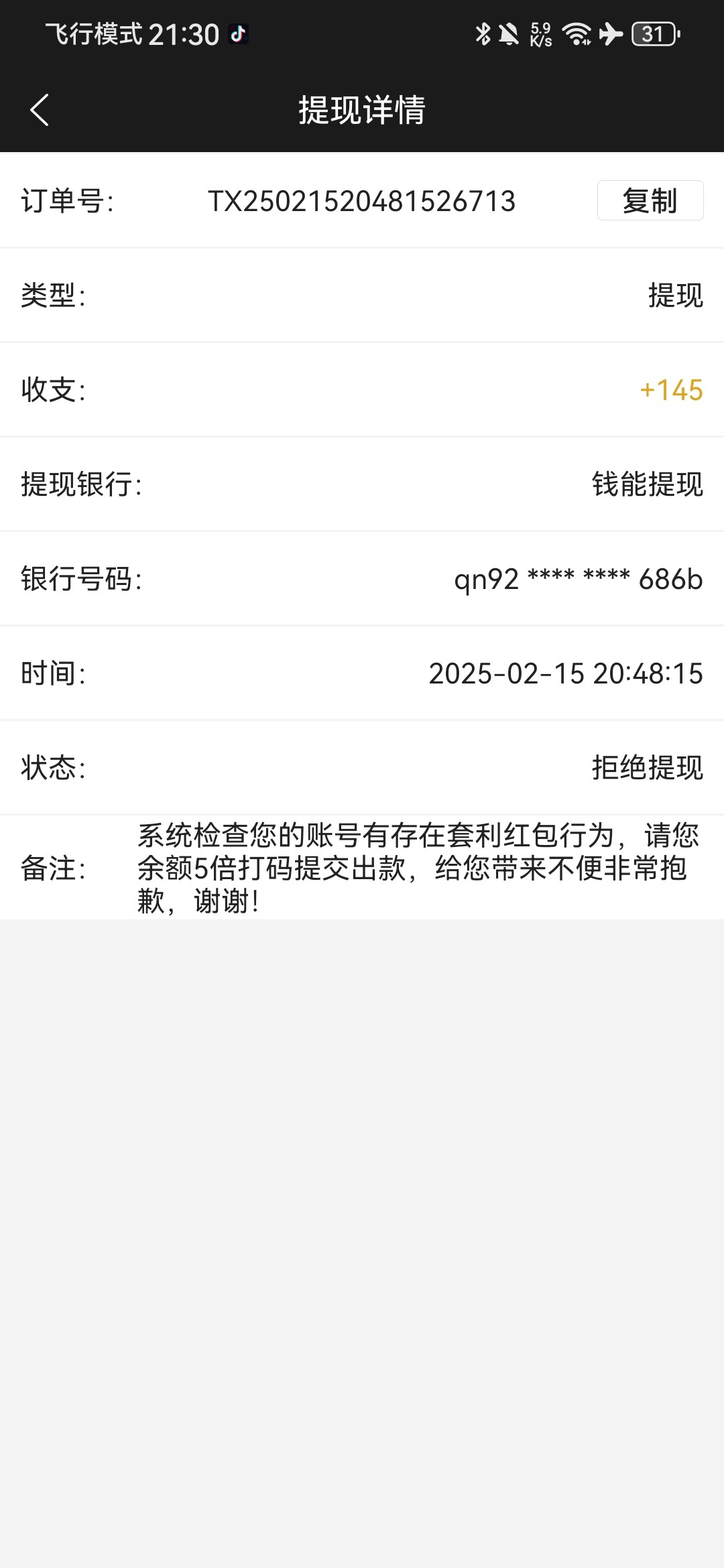 抢一块红包麻将直接进免费给了四十,然后拉女王两块不给,最后剩一块拉0.8马上进,爆了140,我怕不给出还充值了点,结果还是提现退回,要五倍流水,最后打没了,啥也没捞着心态爆炸