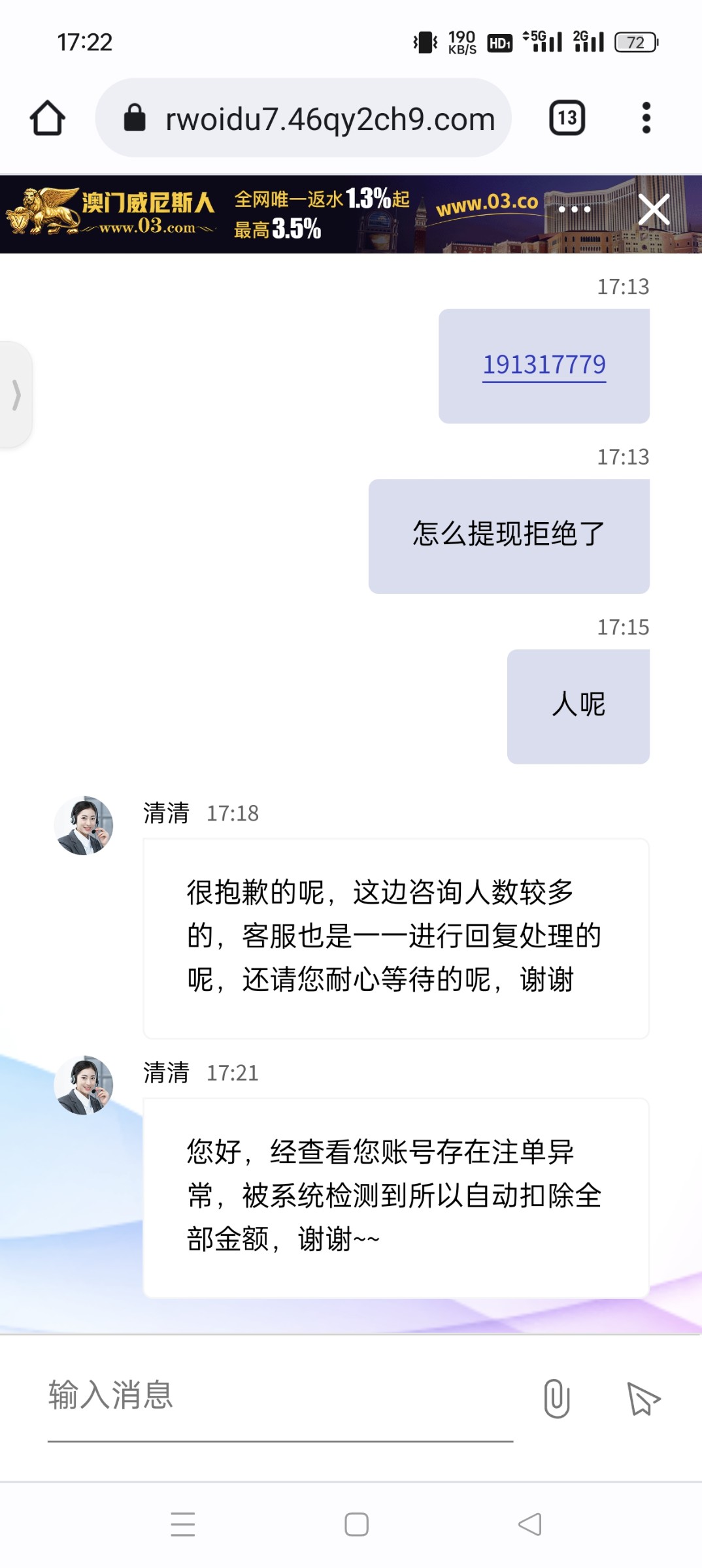 提现扣掉了 问客服就是下注异常 她妈的一直玩麻将 搞不懂哪里下注异常