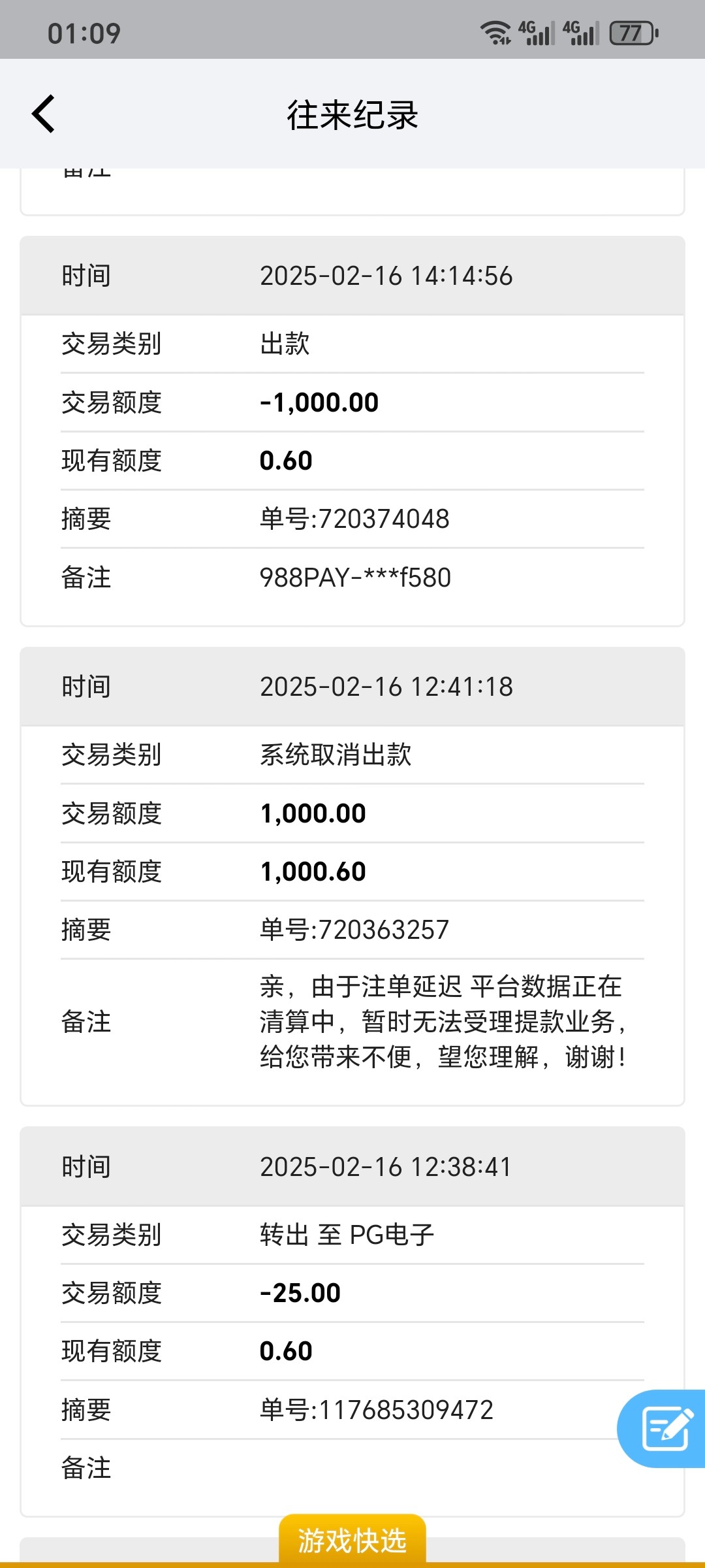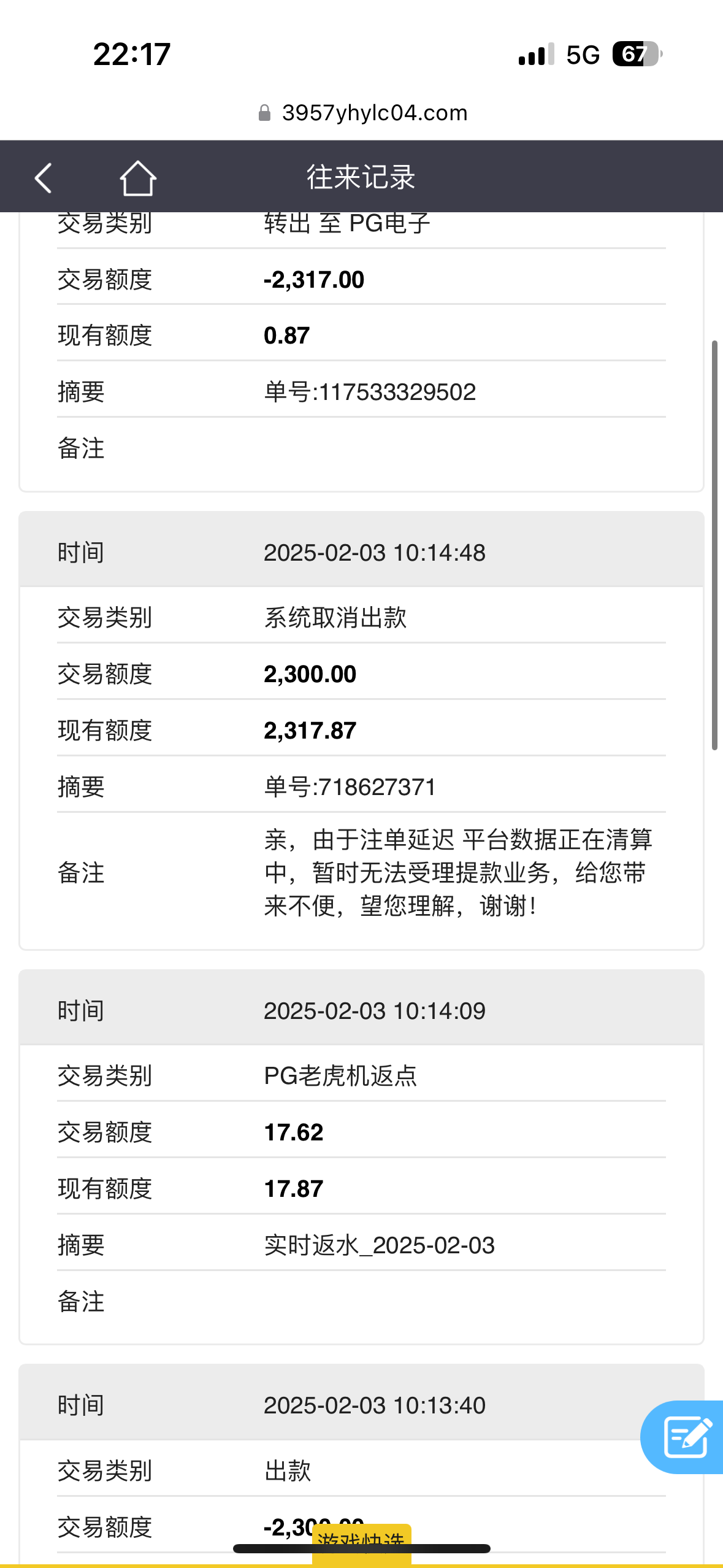 情况一样,被黑2300,被黑前一样还提过3000而且还是秒到,想不到他2300都黑了,也是像你一样,之前玩提过好多次几千都不黑,客服说一直不更新,然后问多几次客服直接说:您好,由于您被游戏商方封停处理的用户,我司终止提供任何帮助和服务,请您前往其他平台进行娱乐,若有不便之处敬请谅解。谢谢!