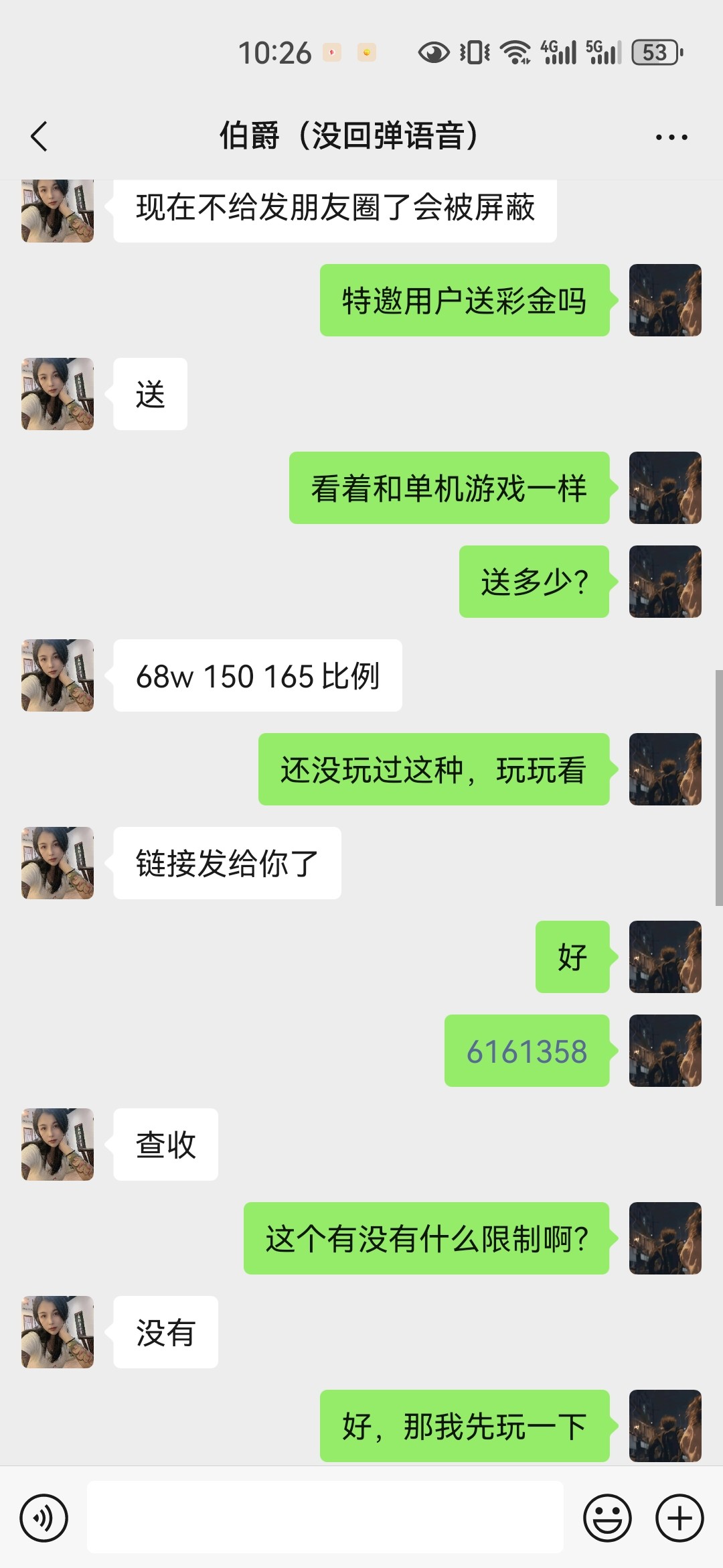 昨天下午微信添加我好友,送我体验金165万,比例是100块钱金币的那种台子,应该好多,老哥可能也玩过这种,他送了我65万,我打到了170多万,然后给他发信息下分,一直没人回复我,看朋友圈看不到内内容了,一打电话显示对方账号异常,今天闲着没事,早上又在打170多万,陆续打了两个多亿,165万比例100的话,下分能下一万多,天杀了他微信账号异常,现在联系不上,唉,怎么办?只有等他解封或者怎么样嘛?一万多白没了,我都想好了,如果他微信解封的话,我先充个几百,然后两个多亿金币分批下,看看能回来的话给老哥们发300瓶牛子团20份猪脚饭