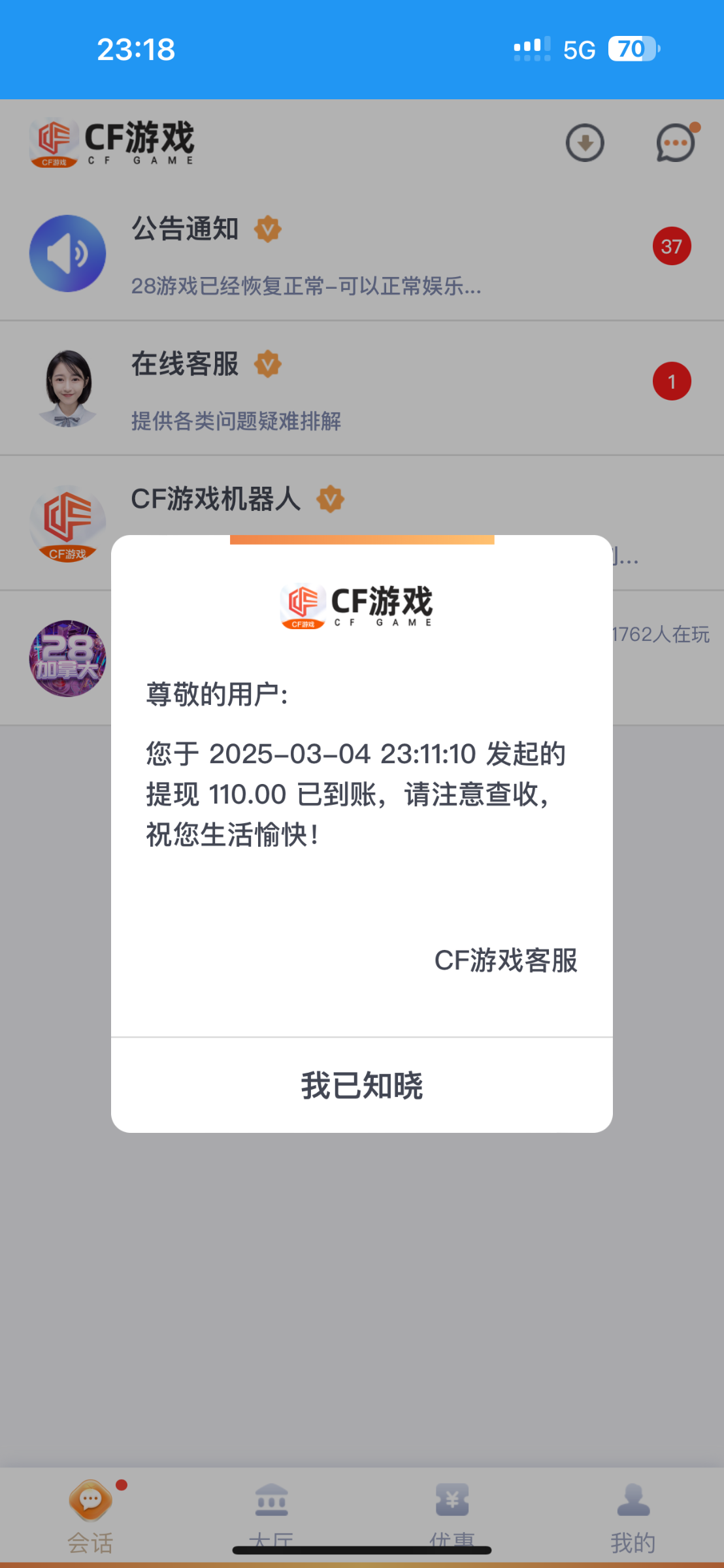 白嫖100到账,加好友很慢几天通过的,提款找下客服支付宝秒打