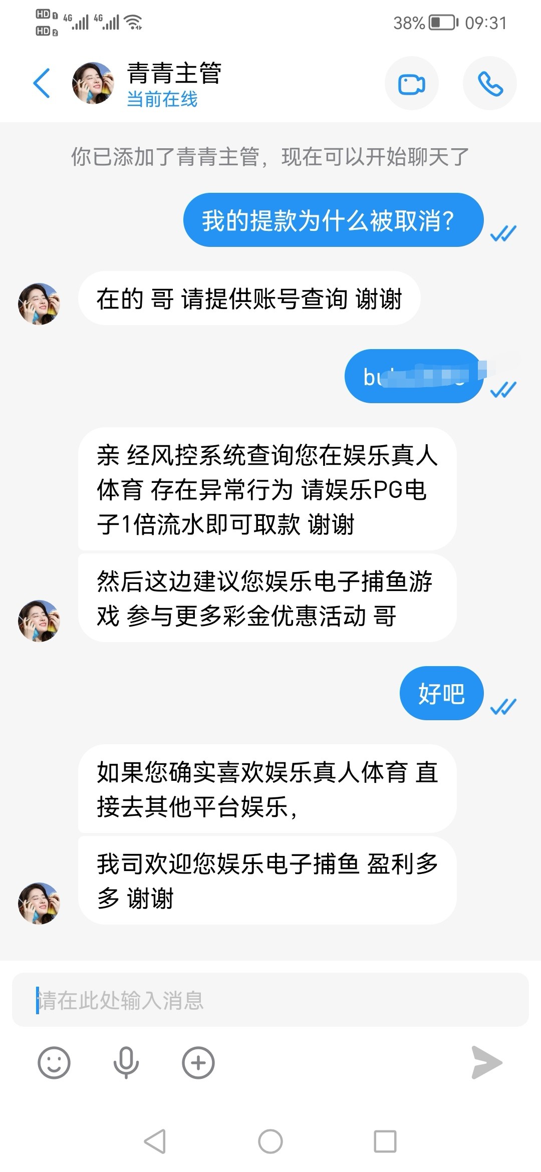 居然说不欢迎我在他们家玩体育和真人,关键这俩之前一直都是输钱状态,就昨天赢了三千,提款退回,在找客服,直接让我打一倍流水,不过出款还是没问题,以后也不敢去了