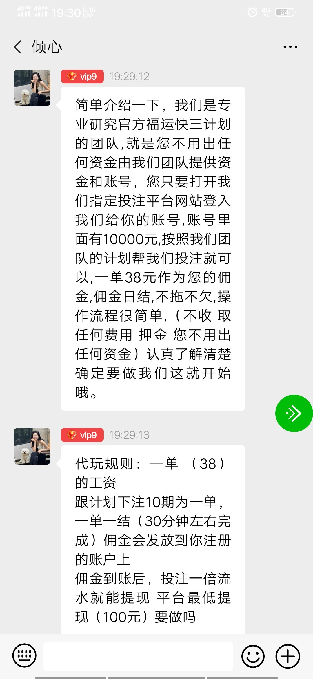 彩票代打,10把一单,佣金56元,随便游戏刷流水最低100出款,打里面的电子爆两次盈利400,直接封号。