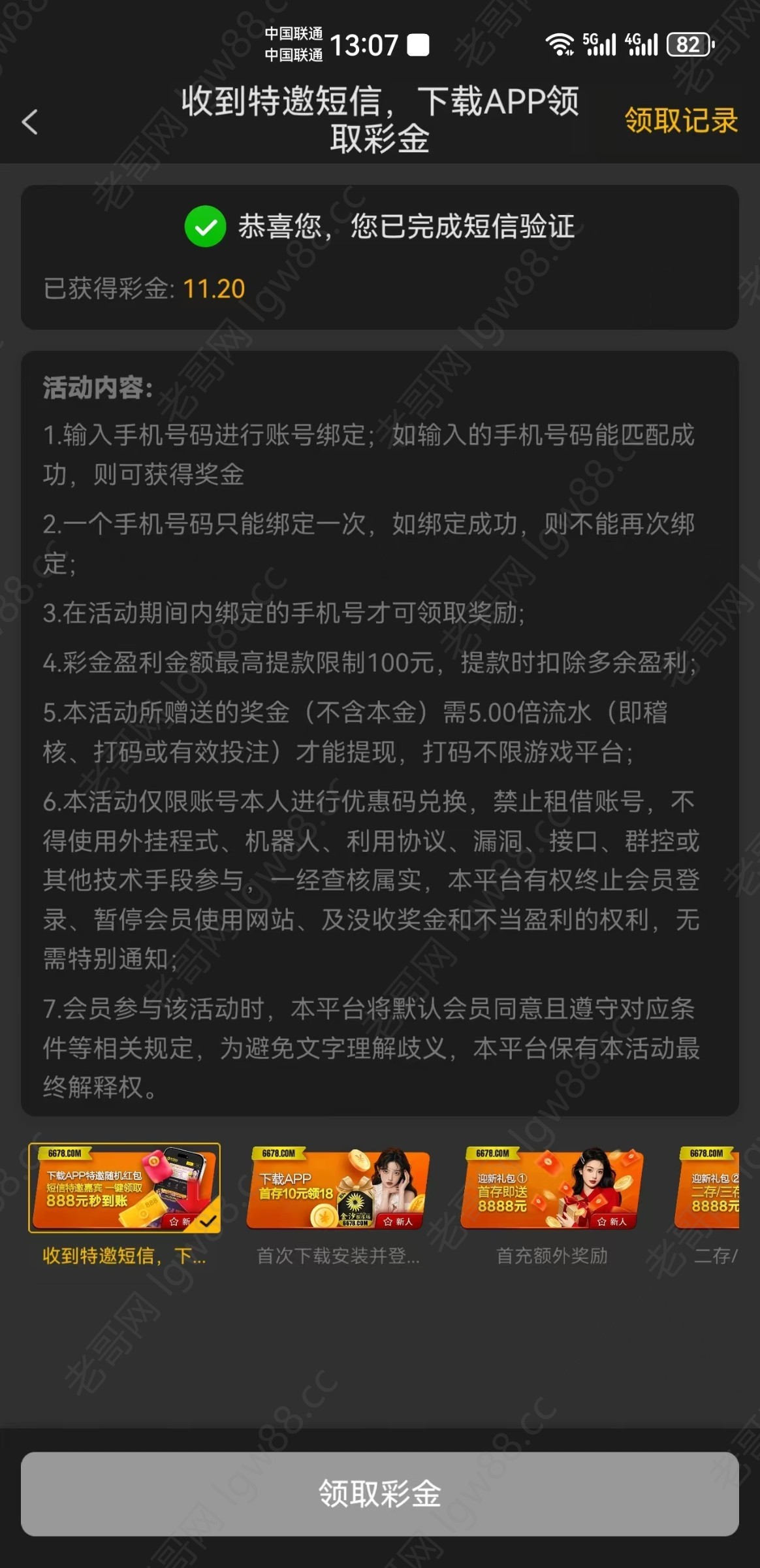 收到短信的,注册下载APP领随机彩金,我领到了11.2,老哥们可以去碰一碰。 6678.com