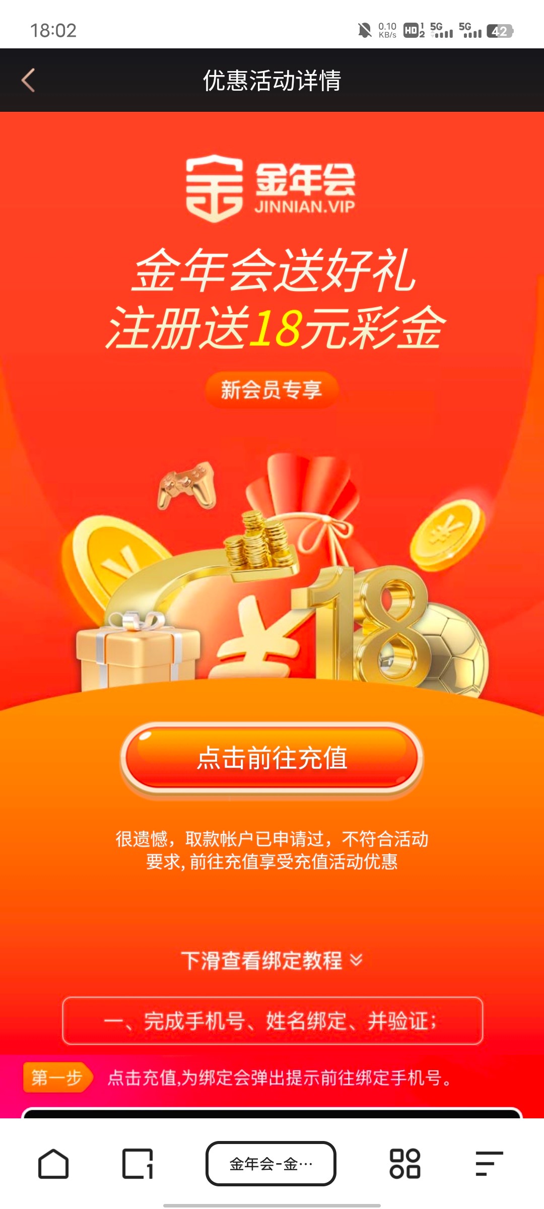 新用户注册绑卡绑定手机号 点击优惠自助领取18元彩金 游戏和提款限制自行查看优惠