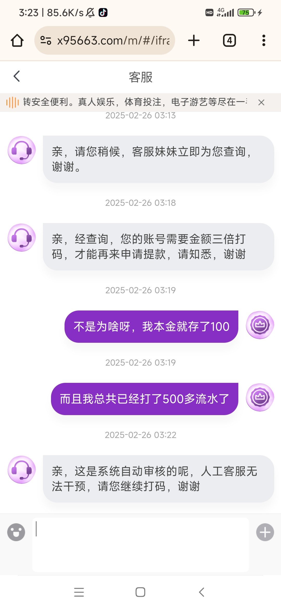 昨天我存了100,打了400多流水,然后他说我只下注庄给我驳回,让我再刷一倍流水,然后刚刚我又流水打够了去提现,然后tmd又罚了老子三倍流水,我不清楚你们特邀的人是怎么样的,但是我建议你们没有特邀的就不要去首存裸打,这就是个没实力的野鸡杂碎台子