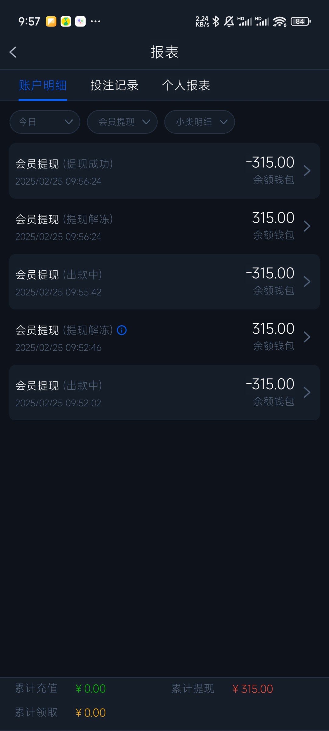 成功下车 充值一百 扣了80盈利 打了流水后盈利到了315 提现成功 舒坦了