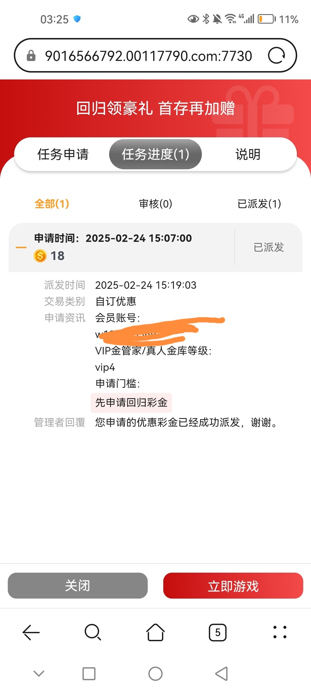申请的时候注意一下,有两个选择,一个是已存款申请,一个是先申请回归彩金,我没充就选择了那个先申请回归彩金,跟我图里一样。