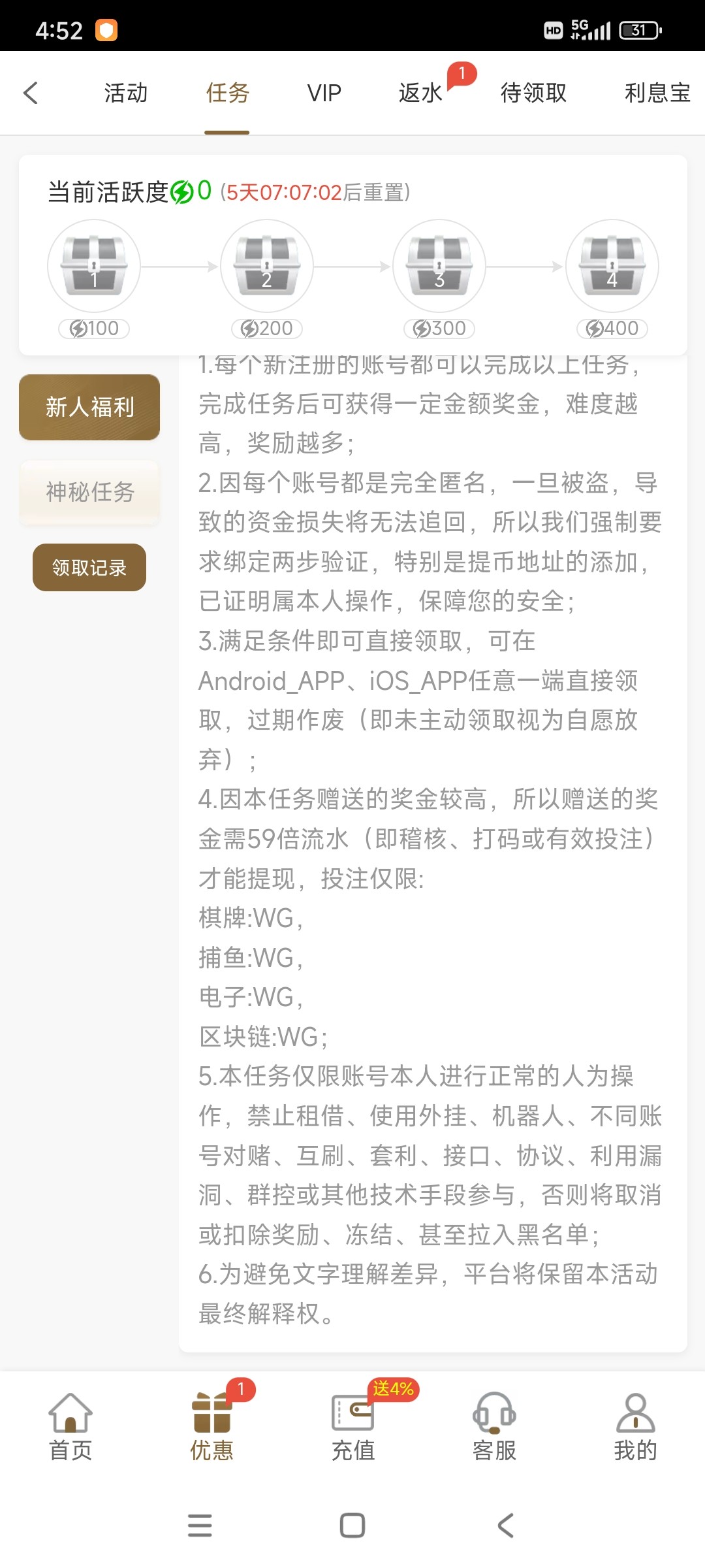 半黑,都说了,没人一定强求你们去充值,这个只是为了告诉大家有这个活动,22送59,就看自己想不想搏,有到账的兄弟多多反馈