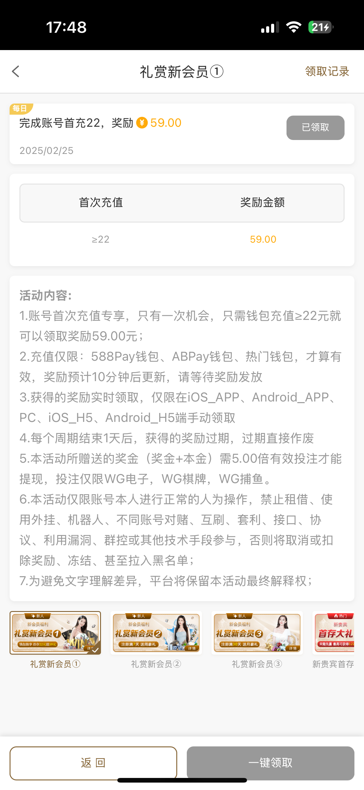 可以的,出了300。充了22先领了22。一看规则9要59倍流水,打没了。这不纯黑台吗。过了十分钟又可以领59。只要5倍流水出了300
