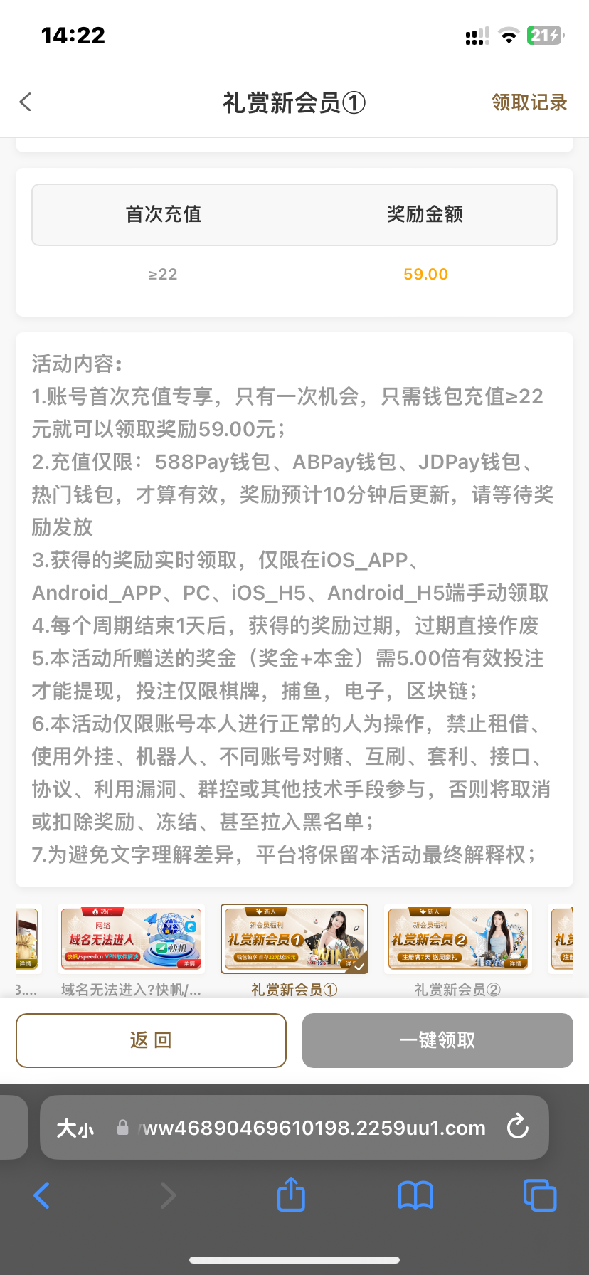 新户注册充22送59,我没打出来,必须用热门钱包充才行,能不能出款暂且未知!只顾分享,被黑别骂!还有个活动是下载app送22,说是自动送,我就没申请,你们可以试试这个!