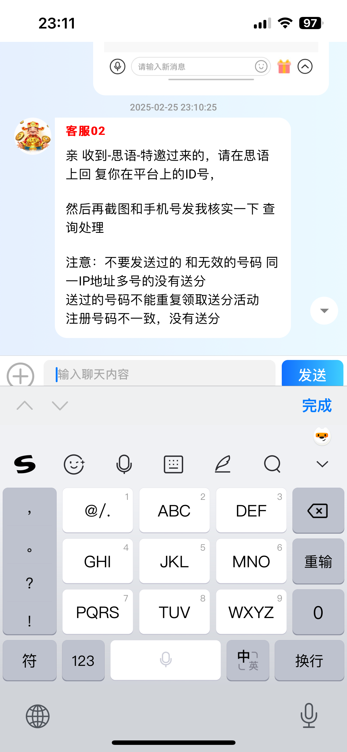 有思雨的去看看 我过去领的时候要查的 还是28-888 我领了38 有限制截图不了 可以对压2.8无限制 亲 注册礼包需玩15期,101元以上 可以下分 链接js588.vip 下载码1997