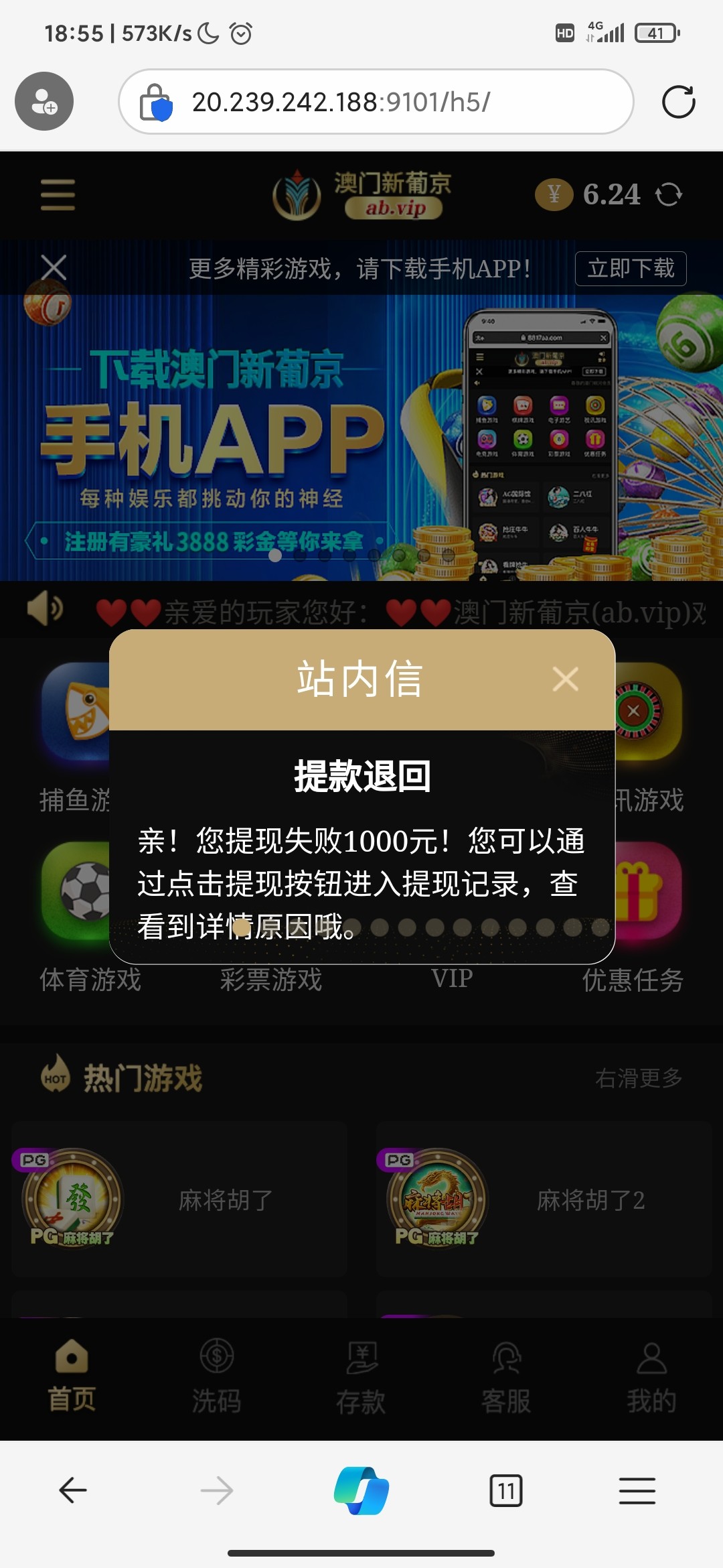 澳门新葡京ab.vip大黑逼台各位老哥注意,事情经过是这样的24年11月份最早电话特邀说的充值100送100打三倍流水出款,后面按照电话说的充值去找了客服结果他妈就送18在线客服和特邀电话说的完全不一样送的也不一样,结果后面直接拉电子流水够了后面没有提拉完了,今天25年2月25又电话特邀说真的送100送68所以抱着试试态度充值了结果他妈又是18妥妥的诈骗没有诚信可言,后面就直接拉麻将船长上了1000直接申请提现失败,问狗庄直接说投注异常扣除盈利,更搞笑的是本金都不能提让我重新打码,妥妥的诈骗台各位老哥避雷啊。