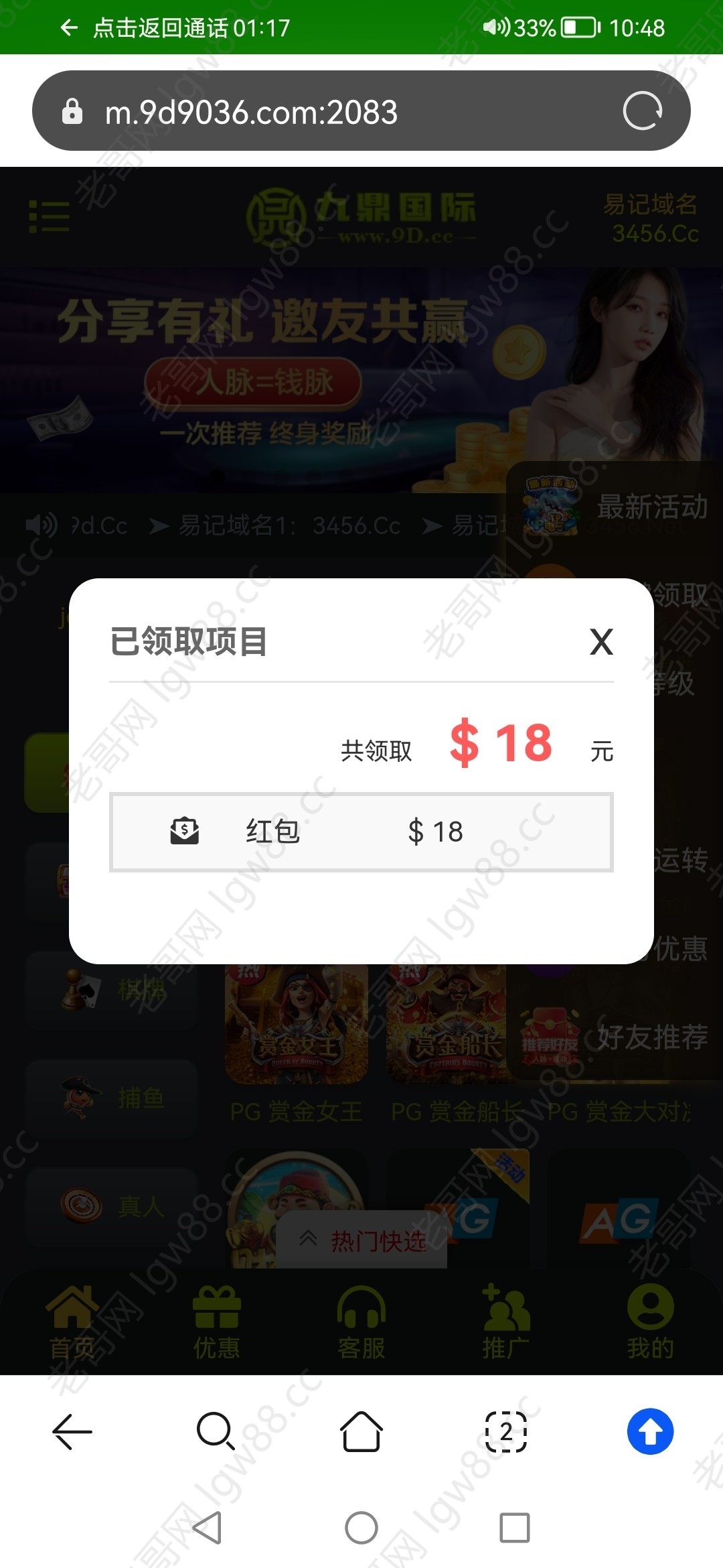 昨天登陆没有彩金。刚刚就接到回访电话了。送了18没打出来。网址是 61106.cc