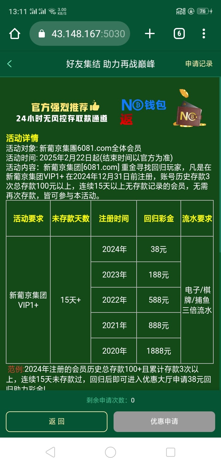 历史注册回馈VIP1+的会员有三次存款达到100以上的会员活动页面申请 地址 081.com