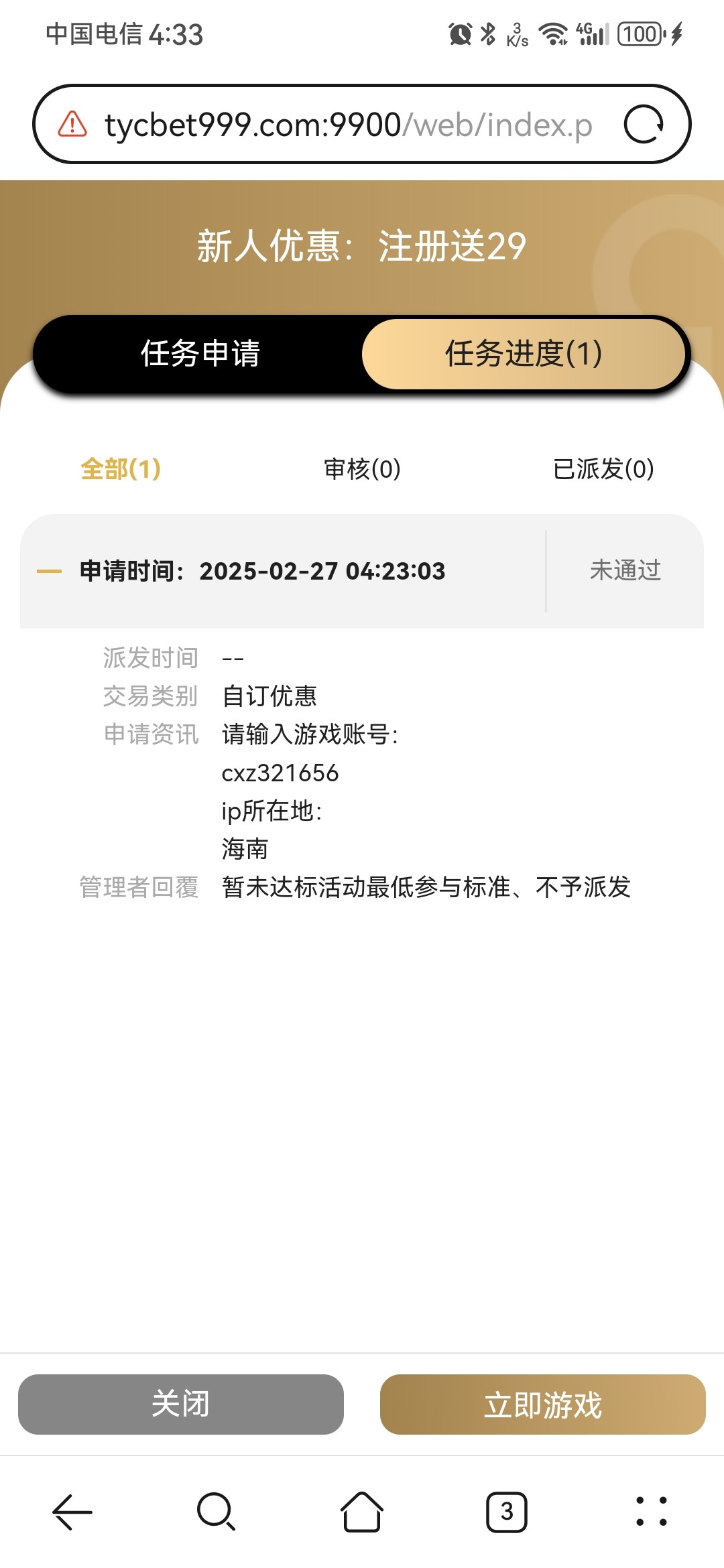 申请没给,充了100想打首存联系不上客服,最后裸打400,提现还加微信。。感觉不像大台子操作,找客服送了29