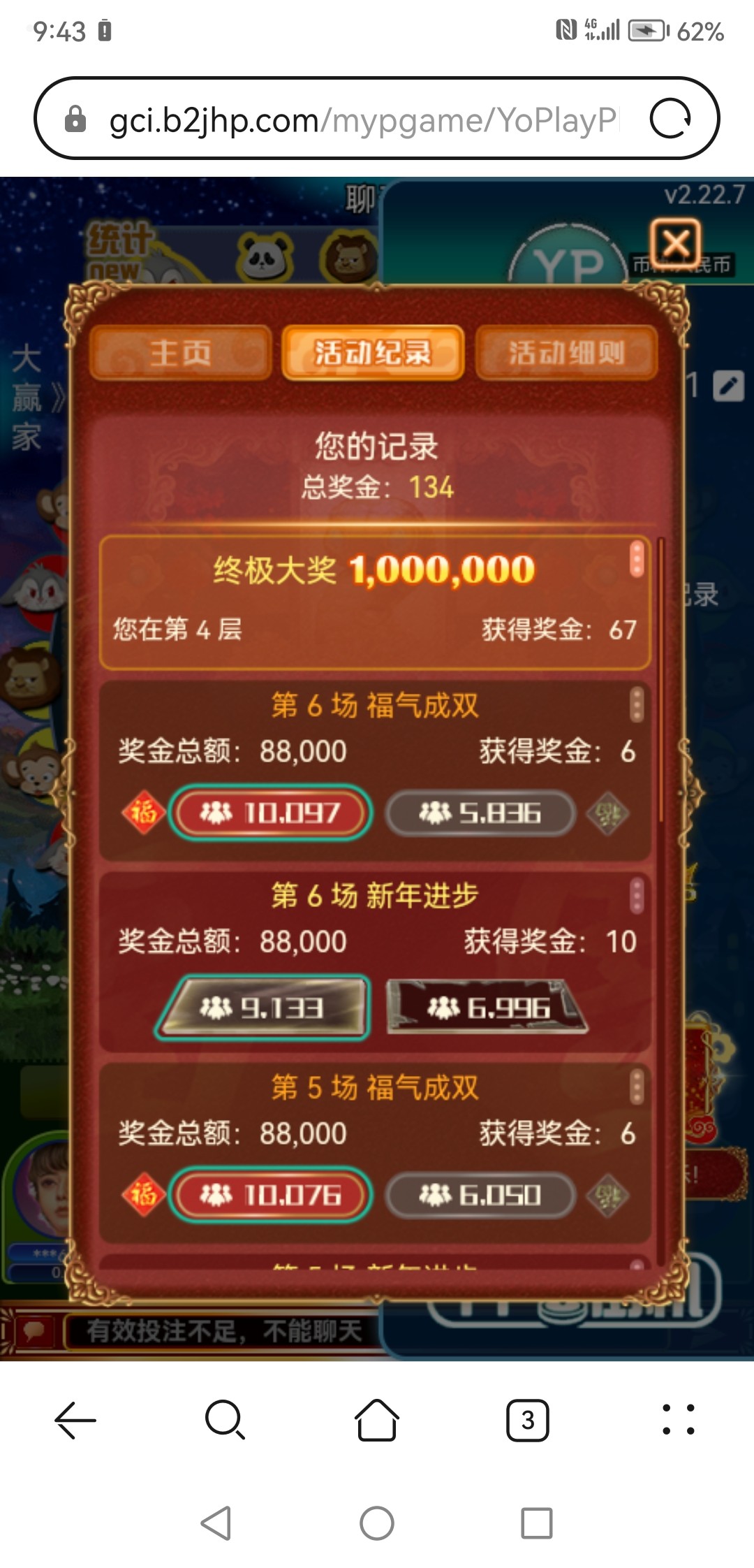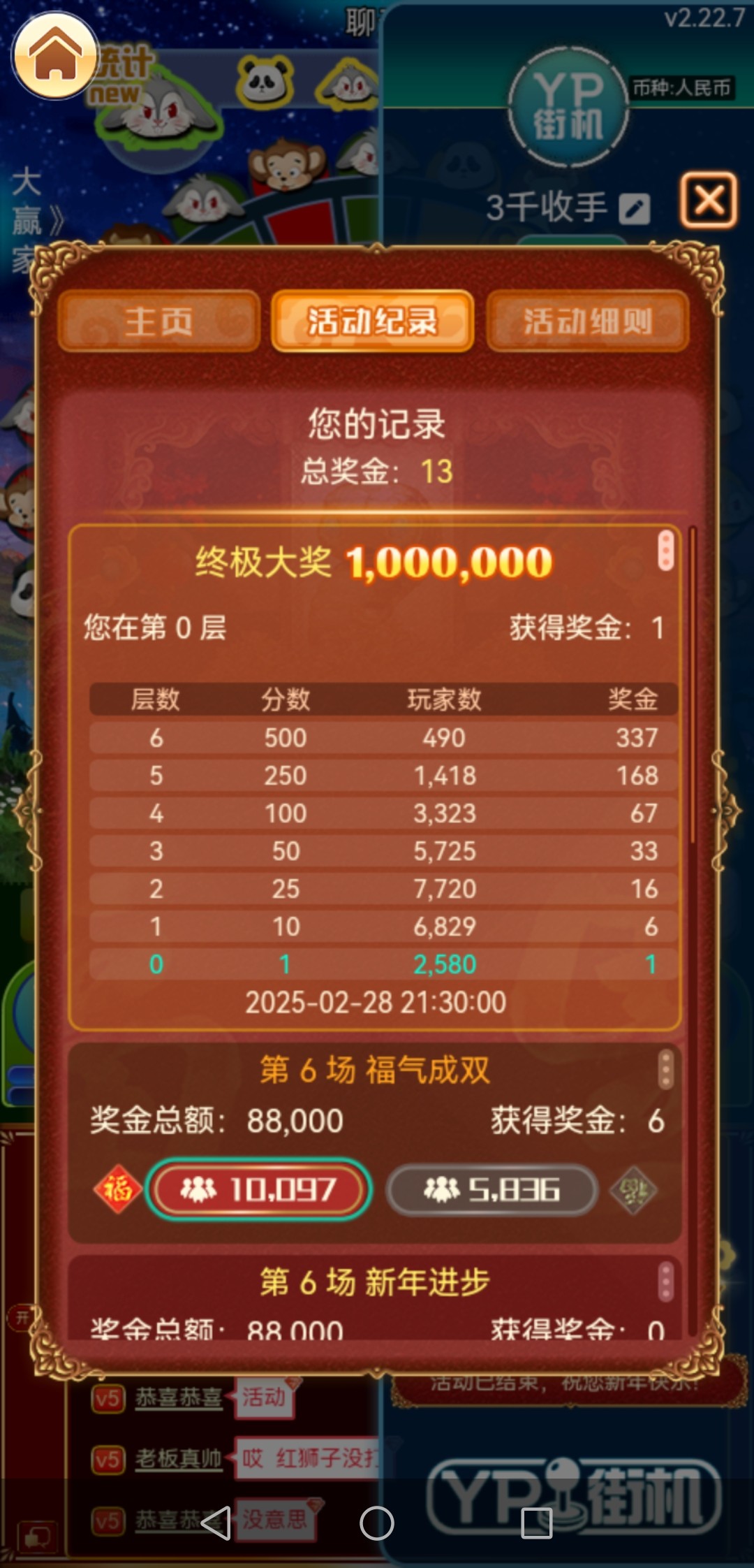 我只能说精彩模板误事,我昨天只有一个精彩模板的进去了,其他的都是维护,之后8点没参加到后面不能参加,168的得了3个号都是第五层,昨天第三次猜错了,总共撸了有1000+,自己没忍住中间打了挂逼有二百多吧